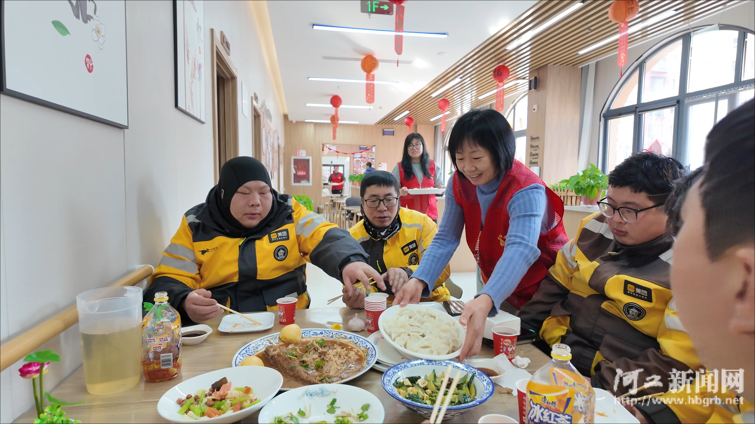 食堂里,一盘盘热气腾腾的水饺端上桌,荤素搭配,还有几样清爽小菜。平日里风里来雨里去、穿梭在大街小巷的城市“奔跑者”,此刻卸下头盔、放下车钥匙,围坐在一起,边吃边聊,笑声不断。在工会“娘家人”的陪伴下,他们难得地放慢脚步,共享这份暖心的团聚时光。