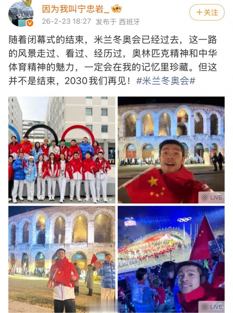 今日为中国队在男子1500米速度滑冰夺金的宁忠岩更新社媒,晒出自己参加闭幕式的照片,并配文写道: