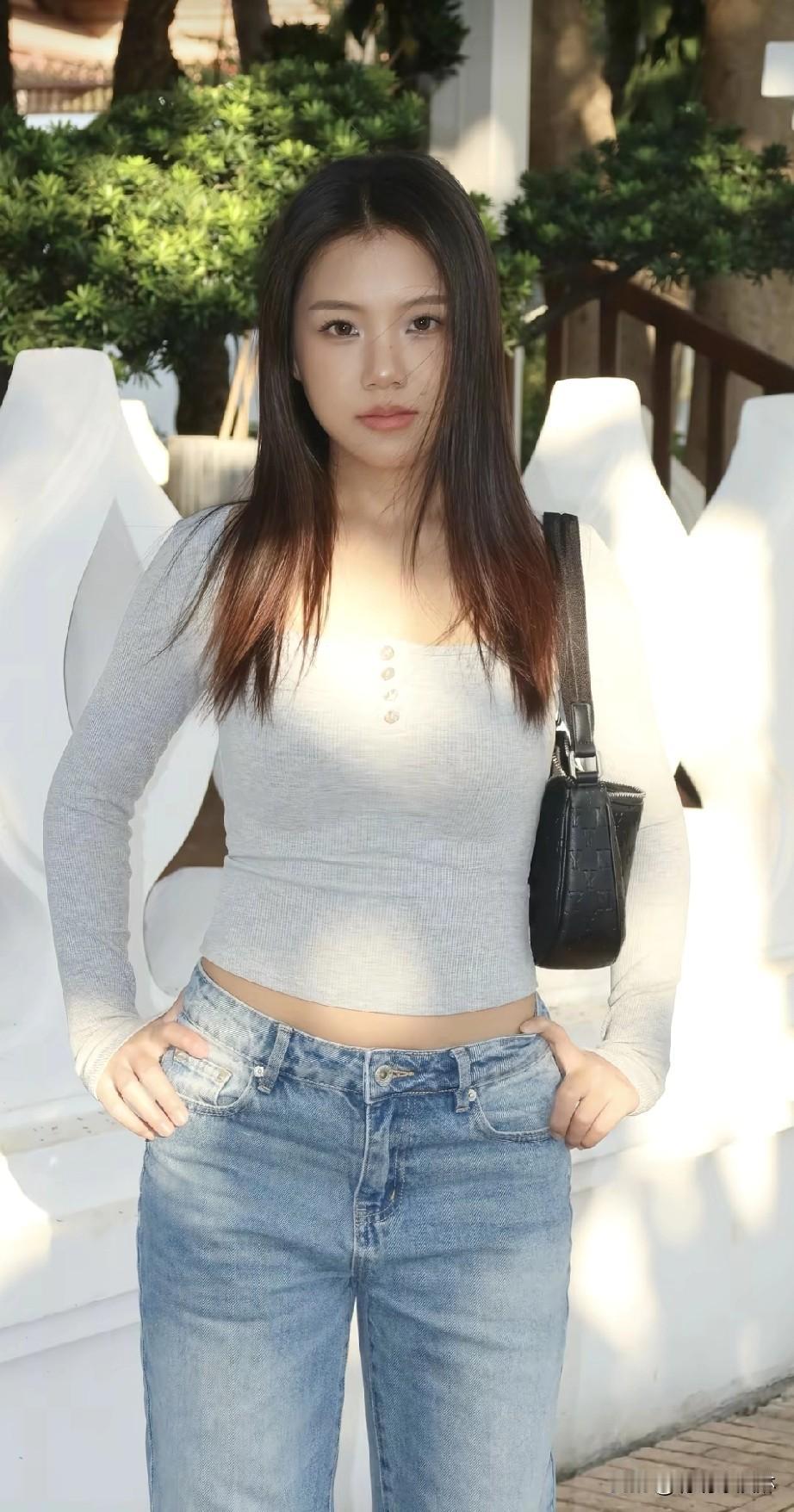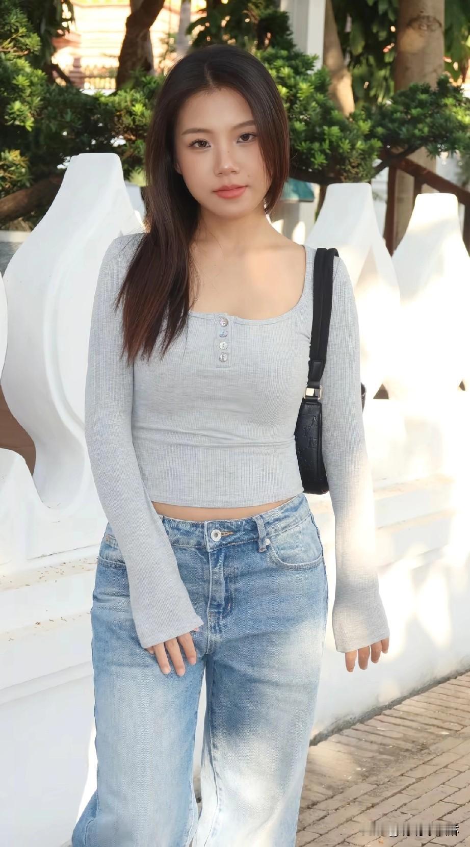 夏日清新穿搭,浅灰色针织衫搭配高腰牛仔裤,简约自然,清新脱俗。