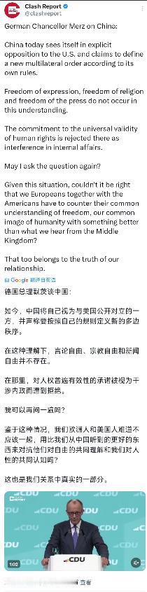 德国总理默茨昨晚(北京时间2月20日晚)发表讲话谈到了中国:“如今,中国将自己视为与美国公开对立的一方,并声称要按照自己的规则定义新的多边秩序。 在这种理解下,言论自由,宗教自由和新闻自由并不存在。在那里,对人权普遍有效性的承诺被视为干涉内政而遭到拒绝。 我可以再问一遍吗?鉴于这种情况,我们欧洲人和美国人难道不应该一起,用比我们从中国听到的更好的东西来对抗他们对自由的共同理解和我们对人性的共同认知吗?这也是我们关系中真实的一部分。”   事实上,中国始终坚持不结盟、不对抗、不针对第三方的外交原则,中国倡导的新多边秩序并非要推翻现有国际体系,而是基于联合国宪章宗旨和原则,对现有全球治理体系进行合理完善,使其更具包容性和公正性。中国从未将自身置于与美国对立的位置,相反一直致力于推动中美关系健康稳定发展,只是坚决反对美国的单边主义和霸权行径,反对任何国家将自身意志强加于人。   默茨对中国自由和人权状况的指责缺乏事实依据。中国宪法明确保障公民的言论、宗教、新闻等各项自由,这些权利的实现有目共睹。中国对人权普遍有效性的认同从未动摇,但各国的历史文化、社会制度、发展阶段存在差异,人权发展道路必然各具特色。中国坚决反对某些国家将人权问题政治化,以人权为借口干涉别国内政,这一立场符合联合国宪章宗旨和国际关系基本准则,也得到了世界上绝大多数国家的理解和支持。   值得注意的是,默茨的这番讲话与其近期的务实表态存在矛盾。就在2月14日会见中国外长王毅时,默茨还肯定中国取得的辉煌发展成就,承认中国是世界性强国,强调德中经贸关系紧密,双方都是经济全球化的受益者和支持者,明确表示德国反对保护主义、倡导自由贸易,鼓励德国企业加大对华投资合作。短短数日,默茨的表述出现明显摇摆,难免让人对其言论的一致性产生疑问。   德国企业界的行动更能说明问题。德媒披露默茨将于2月24日至27日首次访华,此次行程将有拜尔制药、大众汽车、西门子等约30位德国企业高管随行,有意向随行的商界人士远超这一数字。德国经济研究所的数据显示,去年前11个月德国企业对中国的投资额较上年同期增长超五成,众多德企不仅没有减少对华合作,反而扩大在华投资规模,甚至将部分本土产能搬迁至中国。这些市场行为充分证明,中德合作符合双方核心利益,是基于现实需求的战略选择。   欧洲与美国在对华政策上存在本质差异,默茨呼吁欧美联手对抗中国的主张并不符合欧洲的战略自主诉求。欧盟多次强调坚持战略自主,不愿在中美之间选边站队。中国与欧盟是全面战略伙伴,双方在经贸、绿色转型、气候变化等多个领域存在广泛共同利益,第二十四次中国-欧盟领导人会晤已明确双方反对“脱钩断链”,坚持通过对话协商妥善解决分歧。   中国提出的全球治理倡议,倡导主权平等、国际法治、多边主义等五大原则,已得到国际社会广泛响应。中国始终是多边主义的坚定践行者,也是全球发展的积极贡献者。默茨的讲话显然误读了中国的外交政策和发展理念,忽视了中德、中欧合作的深厚基础和巨大潜力。   在当前全球经济复苏乏力、地缘冲突频发的背景下,各国更需要加强团结合作,而非制造对立。中德作为全球主要经济体,保持双边关系健康稳定发展,不仅符合两国人民的根本利益,也有利于世界的和平与繁荣。希望默茨政府能秉持客观公正立场,摒弃意识形态偏见,以即将到来的访华为契机,推动中德关系回到务实合作的正确轨道,而不是被阵营对抗的思维带偏。