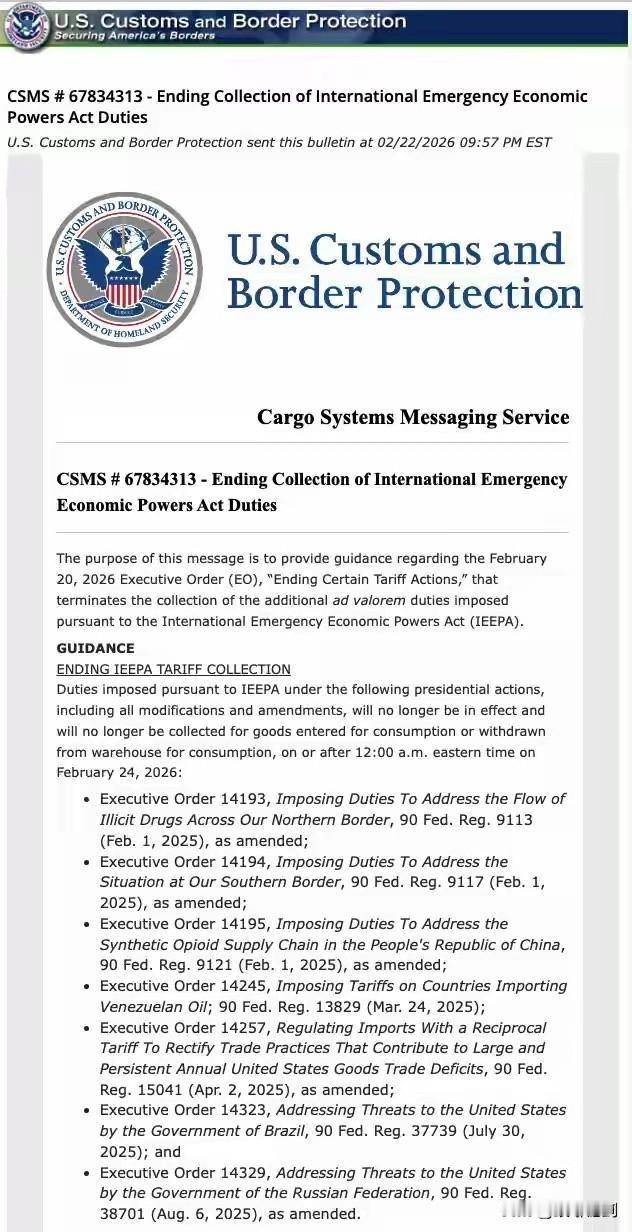 定了!2月24日生效!美国突然取消两项对华关税,中国迎来3大变化 不是大反转,但每个外贸人都要读懂! 美国海关深夜官宣,重磅消息落地。 2月24日起,正式终止两项对华关税。 涉及芬太尼相关关税10%, 以及对等报复性关税10%。 合计取消20%税率,看似力度空前。 但关键细节藏在后面: 特朗普火速补征15%临时关税。 算下来,整体税率仅下降约5个百分点。 对中国出口行业,这是实打实的减负。 家电、电子、纺织、家具企业最受益。 报价灵活度提升,订单有望温和回暖。 但要清醒:301关税、钢铝关税仍在, 高关税环境并未根本改变。 对中美关系,这是明确的缓和信号。 此次取消源于美最高法院的违宪裁定, 为特朗普3月底访华扫清了部分障碍。 贸易摩擦短期降温,博弈却未停止。 美国对华科技管制、供应链审查, 只会更加严格。 对中国长远发展,倒逼效应更关键。 小幅关税减负难改外贸格局, 开拓新兴市场、产业升级势在必行。 东盟、中东、拉美将成中国出口新主场, 高附加值产品、自主品牌出海, 才是破局的核心。 一句话总结: 这是缓和不是转向,是减负不是松绑。 中国外贸,短期稳信心,长期靠自强! 美国对华关税新政策 中国外贸新动向