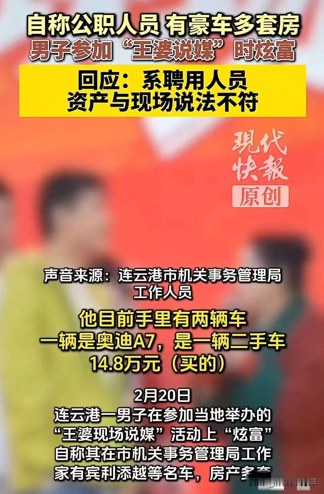 “吹牛一时爽,打脸啪啪响!”河南开封,36岁男子参加“王婆说媒”节目,在台上,他高调的说,自己机关单位上班,还有副业。王婆见男子口无遮拦,赶紧说,有副业台下说去,可男子还不“刹车”,又炫富说,自己家里有宾利,保时捷,奥迪,光房子就好几套!这下事闹大了,此事在网上传开。 网友炸锅了:这智商怎么攒到这么多钱的?他不知道公职人员不能经商吗? 2月20日,该男子在连云港园博园“王婆现场说媒”活动中登台发言。他自称在市机关事务管理局工作,现场列举多辆豪车及多套房产,引发网友对公职人员违规经商及财产来源的质疑。 连云港市机关事务管理局随后发布通报。通报显示,该男子为单位聘用人员,并非正式公职人员。其名下仅有一辆二手奥迪A7,购入价14.8万元,所谓宾利、保时捷及多套房产均为不实表述。 通报一出,舆论反转。此前网友对“公职人员炫富”的愤怒,转为对该男子“吹牛翻车”的调侃。有网友翻出其过往社交动态,发现他长期在网络上包装自身形象,伪造财富证明,此次在公开活动中彻底暴露。 事件暴露出两个核心问题。其一,该男子对公职人员管理规定缺乏基本认知,公然触碰“严禁违规经商”的红线,即便身份不实,也反映出对规则的漠视。其二,他将“炫富”作为婚恋筹码,折射出部分人扭曲的价值观,试图用虚假财富包装获取关注。 从传播角度看,事件发酵迅速,源于其精准踩中公众对公职人员廉洁性的敏感神经。当“机关单位”与“副业炫富”绑定,天然具备话题爆点。而官方通报的及时回应,有效遏制了谣言扩散,维护了公职人员队伍的公信力。 此次事件也给所有人敲响警钟。在信息透明的时代,任何虚假包装都难以长久。越是试图用身份和财富抬高自己,越容易在真相面前摔得更惨。真诚和踏实,才是立足社会的根本。 各位读者你们怎么看?欢迎在评论区讨论。