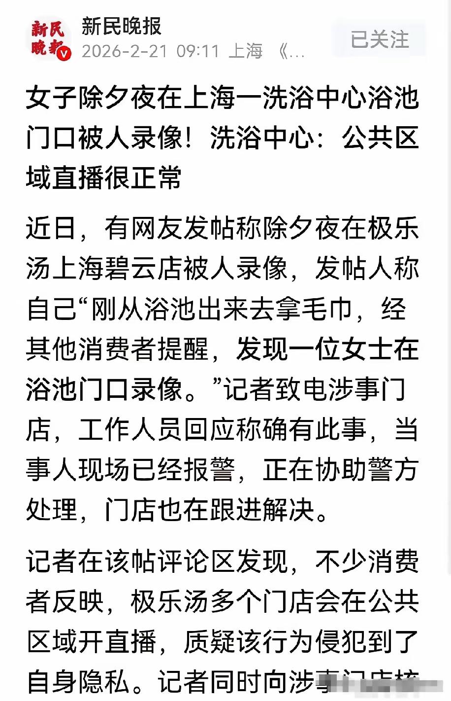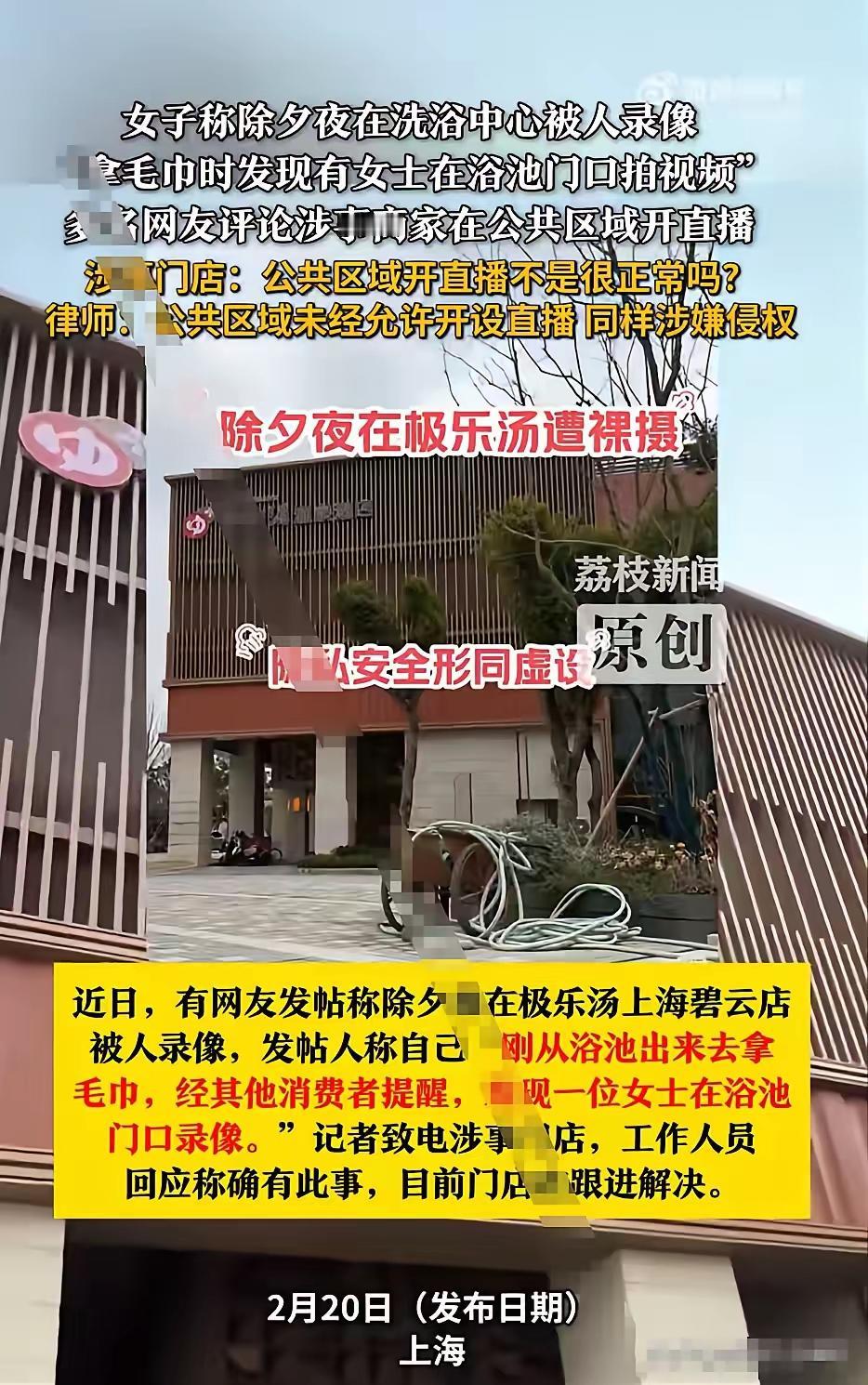 上海,一女子在除夕夜去洗浴,出来够准备去取毛巾,就在这毫无遮掩的几秒,旁边另一位女子提醒她:快遮一下,那边有人在录像。女子一看,果然有人正站在浴池门口,手机镜头正对着出浴的人群,她瞬间感到一阵脊背发凉,那种在私密空间,被窥视的羞辱感让她浑身发抖。她披上衣服就冲过去质问,面对质问,对方言辞闪烁,女子没有退缩,当即报警。 上海警方接到报警后第一时间赶赴涉事洗浴场所,当场控制录像人员,暂扣涉案手机并展开数据提取与核查。除夕夜本是卸下疲惫、安心放松的时刻,当事人怀着愉悦的心情前往消费,却在毫无防备的私密状态下被镜头对准,这种精神上的冲击与羞辱感,会在短时间内留下强烈的心理阴影。现场多位顾客对此感到愤怒,大家选择洗浴场所,核心诉求就是获得私密与安全的消费环境,没人愿意在放松状态下被陌生人随意拍摄记录。 涉事洗浴中心的浴池出口区域,属于法律认定的隐私敏感空间。顾客在此处身体处于暴露状态,个人形象与活动都属于不愿被他人窥视的私密信息。2026年正式施行的《上海市特种行业和公共场所治安管理条例》明确规定,洗浴、温泉类经营场所必须履行隐私安全保障义务,对侵害他人隐私的行为及时劝阻、制止并报告公安机关。门店工作人员未及时发现并制止拍摄行为,部分人员还将公共区域随意录像视作正常现象,这种管理失职与认知偏差,直接加剧了消费者的权益受损程度。 偷拍他人私密状态的行为,早已突破公序良俗的底线,更触犯国家法律。2026年新修订的《中华人民共和国治安管理处罚法》第四十二条明确,偷窥、偷拍、窃听、散布他人隐私的,可处五日以下拘留或五百元以下罚款,情节较重的处五日以上十日以下拘留,可并处五百元以下罚款。一旦拍摄内容被传播、售卖,行为人还将涉嫌传播淫秽物品罪,承担有期徒刑、拘役等刑事处罚。当事人没有隐忍退让,没有因尴尬放弃维权,果断对峙并固定证据报警,这是面对隐私侵害最正确的处理方式。 近年来,洗浴、温泉、健身房更衣区等场所的隐私侵权事件多次发生。部分人员无视他人人格尊严,以拍摄、直播为目的侵入私密空间,个别经营方为了流量与热度,默许甚至纵容此类违规行为。消费者支付费用购买服务,人格尊严与隐私安全是最基础的消费权利,这不是额外诉求,是经营者必须兑现的服务底线。女性在这类私密消费场景中更容易成为侵害目标,保持警惕、果断维权,才能有效震慑潜在的违法人员。 现场及时提醒的陌生女士同样值得肯定,陌生人之间的善意提醒,直接阻止了隐私侵害范围的扩大。私密消费场所的安全环境,需要顾客之间互相守护,更需要经营方主动尽责。正规洗浴场所应在浴区周边设置清晰的禁止拍摄标识,安排专人对私密区域进行巡查,发现有人持手机对准浴区立即劝阻,从源头消除偷拍隐患。 隐私安全是消费体验的底线,法律红线不容任何个人与商家随意践踏。除夕夜的这起事件,不仅是一次个体维权案例,更是对全行业的严肃警示。只有经营者严格履行管理责任,执法部门依法从严查处,消费者敢于主动维权,才能让每一个人在私密场所都能安心放松,不用在放松时刻承受被窥视的恐惧。 各位读者你们怎么看?欢迎在评论区讨论。
