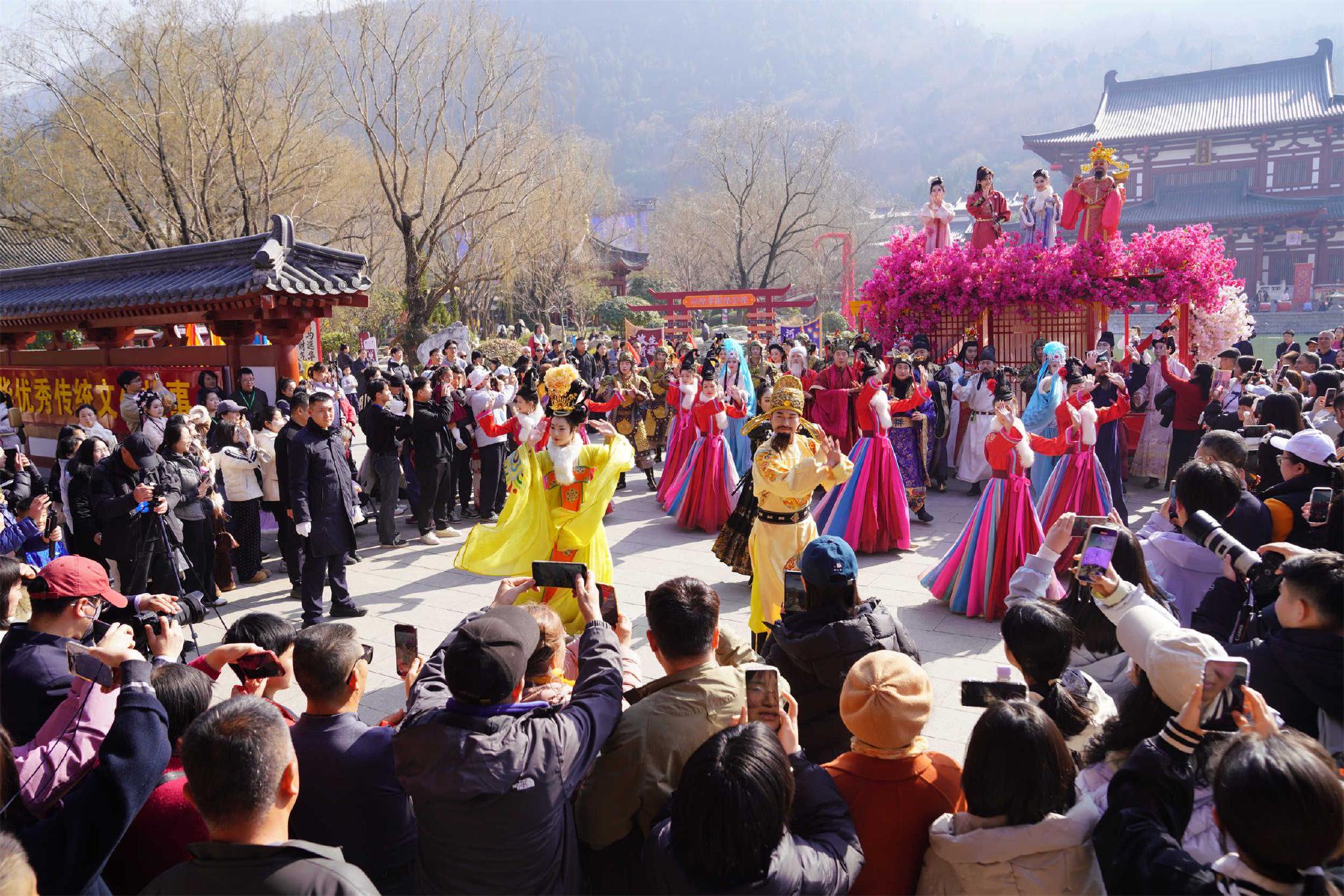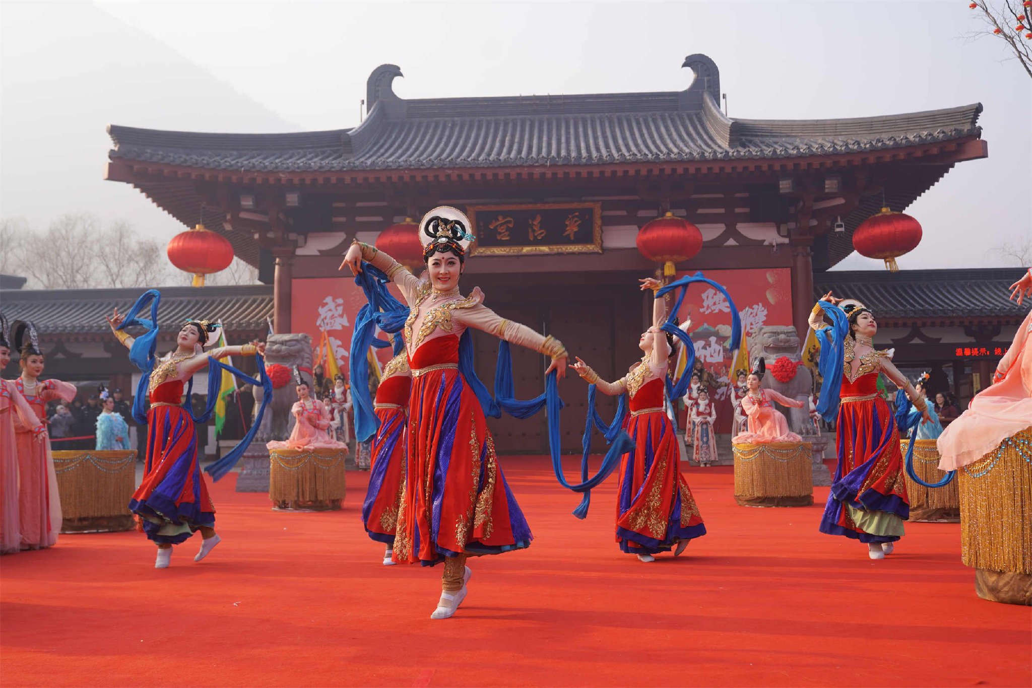 春节假期,华清宫景区深度挖掘盛唐文化内涵,结合新春民俗,推出“复刻盛唐烟火,沉浸式梦回长安”系列活动。每日近百场特色演出轮番上演,涵盖唐宫乐舞、花车巡游、舞龙舞狮等多种形式,全方位营造浓郁的盛唐年节氛围与市井烟火气息。此外,景区还精心编排了《那三个兵》《金仙招婿》《皇上请就位》等趣味互动微演艺,吸引广大市民游客沉浸式体验唐宫新春文化。