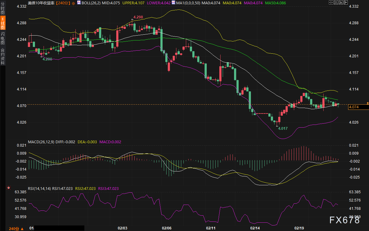 从美债市场的传导机制分析,本轮美元走势的波动与美债收益率的修复节奏高度相关。根据240分钟级别的K线图,10年期美债收益率当前处于大跌后的震荡磨底阶段,最新报价4.074%恰好位于布林带中轨(4.075%)附近。从技术指标看,MACD柱状图已由负转正,表明下跌动能释放充分,短期反弹动能正在积累。但RSI维持在47.02的中性区间,显示市场情绪仍偏均衡,趋势性信号尚未明确。