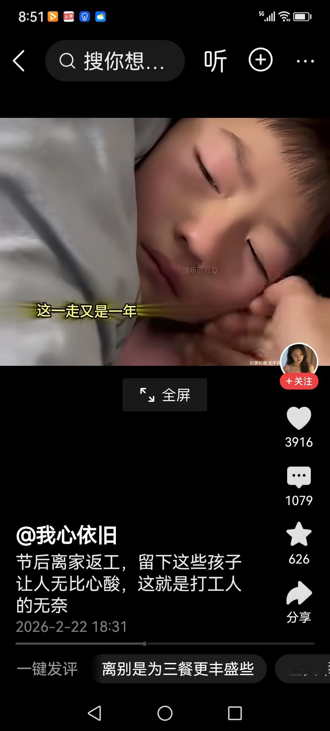 一走便是一年 春节过后,打工人陆陆续续返岗。留下年幼孩子的父母,满脸都是无尽的心酸,这是为了生存而留下的无奈。 皆为那碎银几两,只为让家人能更好地生活。望着年迈的父母和年幼的孩子,他们不禁泪流满面。过着聚少离多的日子,年复一年皆是如此。即便身处山高水远的远方,心中也始终牵挂着故乡。 为了更好地活着,他们别无选择,只能默默咽下离别的痛伤。 看到这样的画面也…。