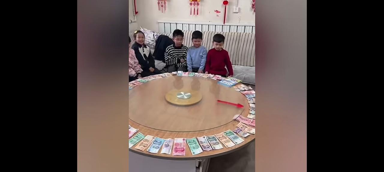 挺有意思,也挺现实。 舅舅没有钱,但是又得给外甥们发压岁钱。于是想了个办法,把所有的钱都换成现金。然后放在桌子上。让外甥们转动转盘,箭头指向哪拿哪一张。也算是既履行了程序,也略微表达了一下自己的意思。 目测了一下,他有7位外甥和外甥女。如果一人,按往年,发500的话,就得3500。如果一人200,那也得发1400。 经过他这一番操作,他今年发了500块钱的压岁钱。而往年,估计少说也得2000。拿的最多的一个人,拿了400块钱。其余的20,10块不等。 老话讲,1块钱难倒英雄汉。这话是一点都不假。