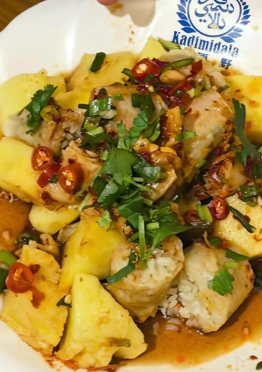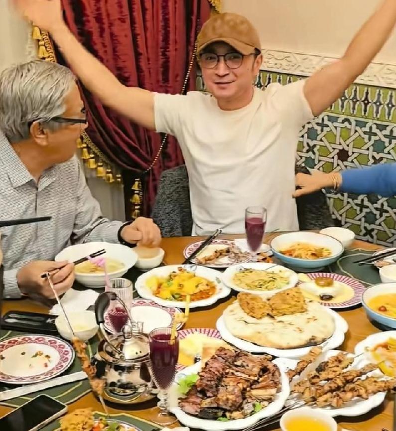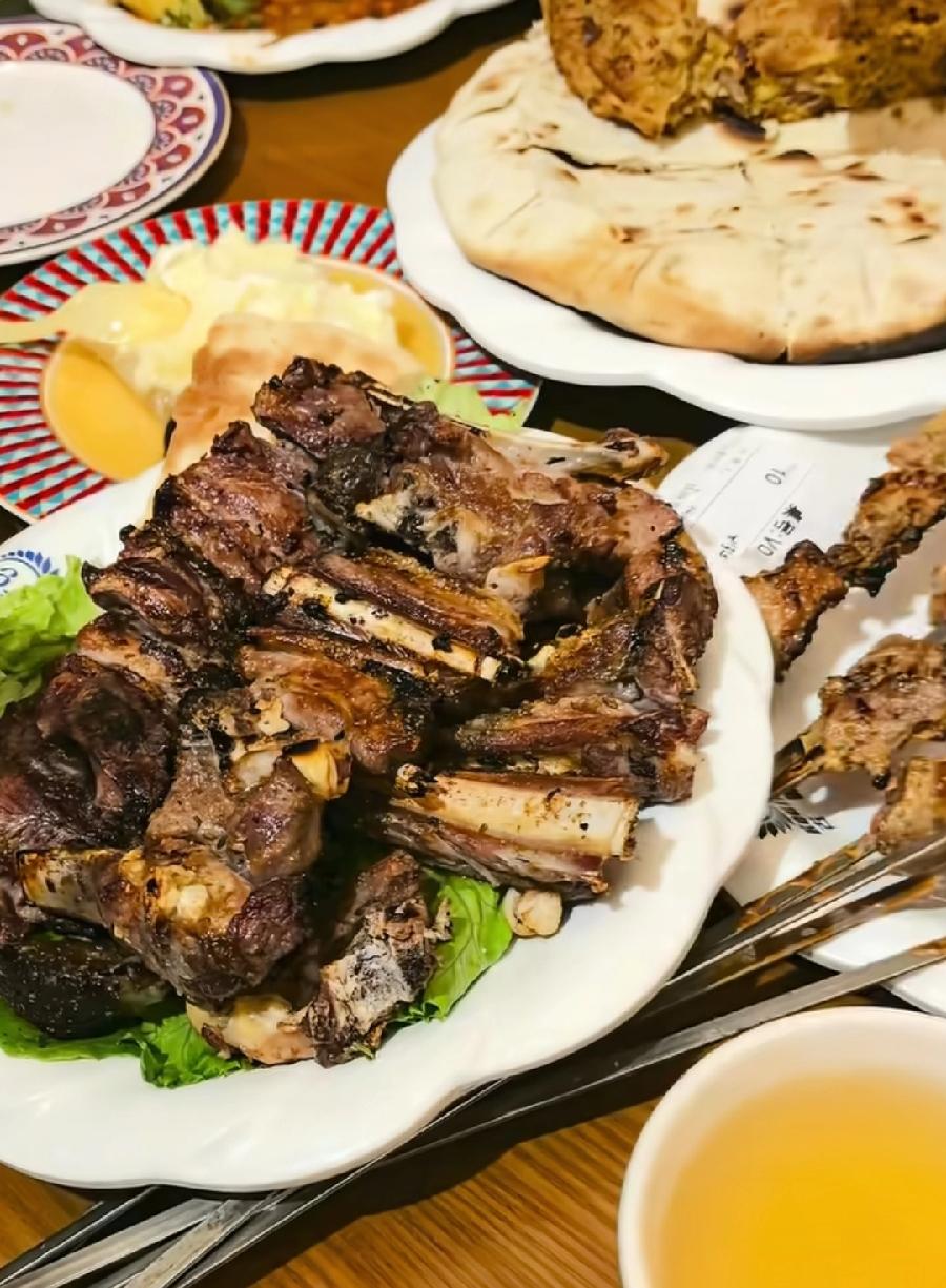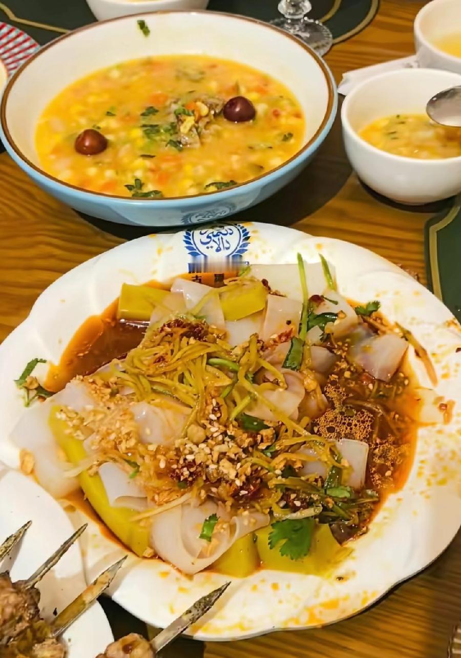 尼格买提家宴没有绿青菜?单盘菜放大看,很多青菜,羊排下面一片大生菜,凉拌面黄瓜丝,还有凉拌凉粉、米饺子,几乎每个菜都有香菜、葱花,离远看确实看不太清,得近看都有,不过都是主菜配的青菜,没有一个单独青菜,倒是真的,尼格买提一家吃的,这是典型的新疆菜系、新疆家宴!