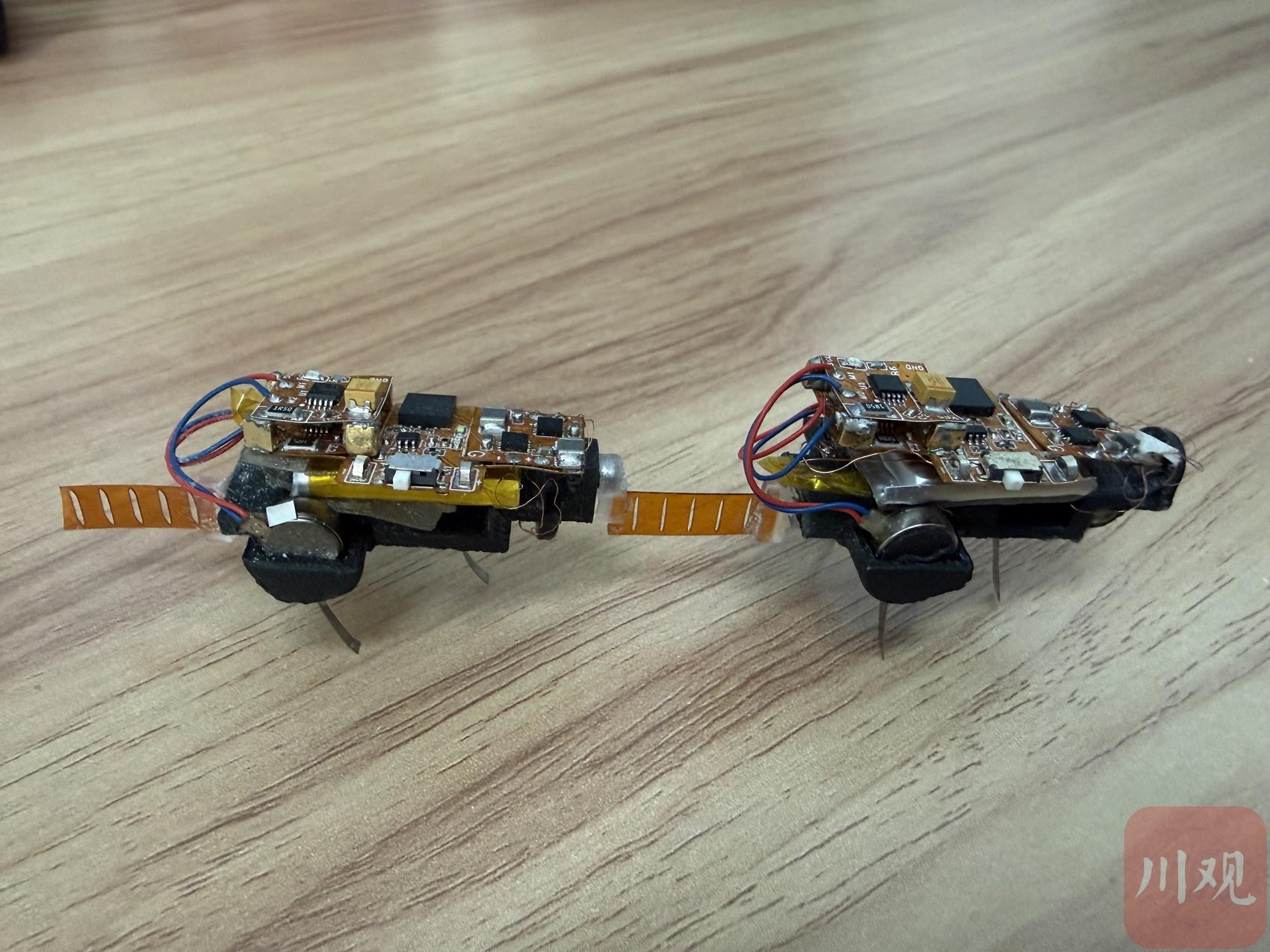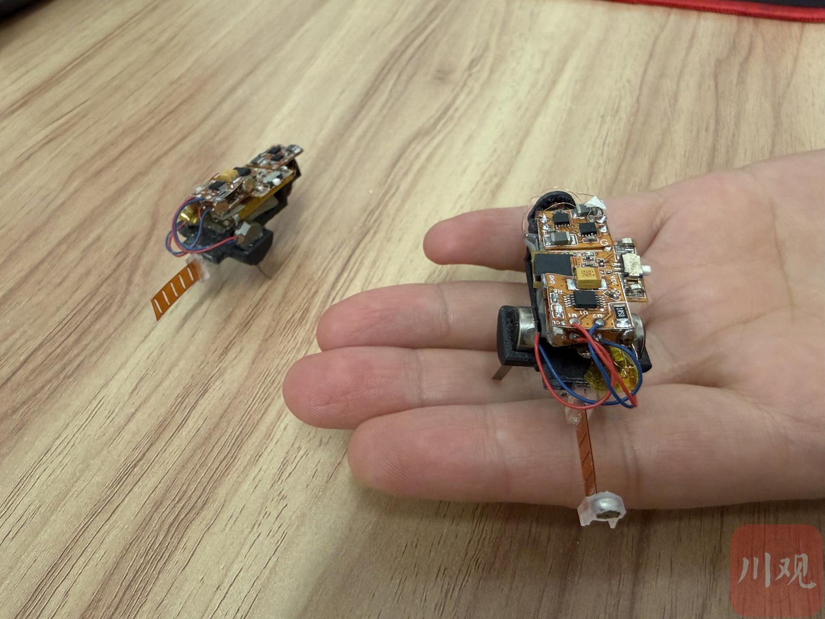 这款电子鼩鼱延续了研发团队一贯的迷你风格:体重仅6克,长约4厘米,宽约2厘米。别看它体形仅有饼干大小,却做到了“五脏俱全”,两个微型电机、电池与电路板构成核心,3条纤细金属腿使其行动敏捷,能前进、转弯甚至绕圈。“微型电机驱动腿部,通过无线遥控指令控制,它就能实现多方向运动。”团队负责人吴一川介绍。