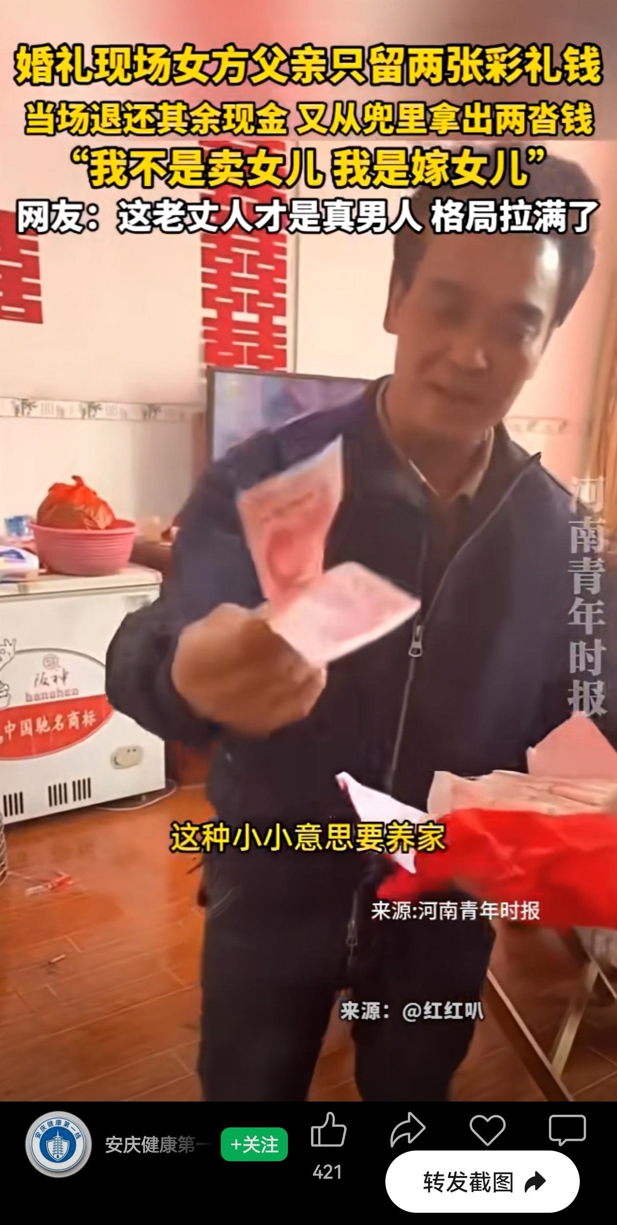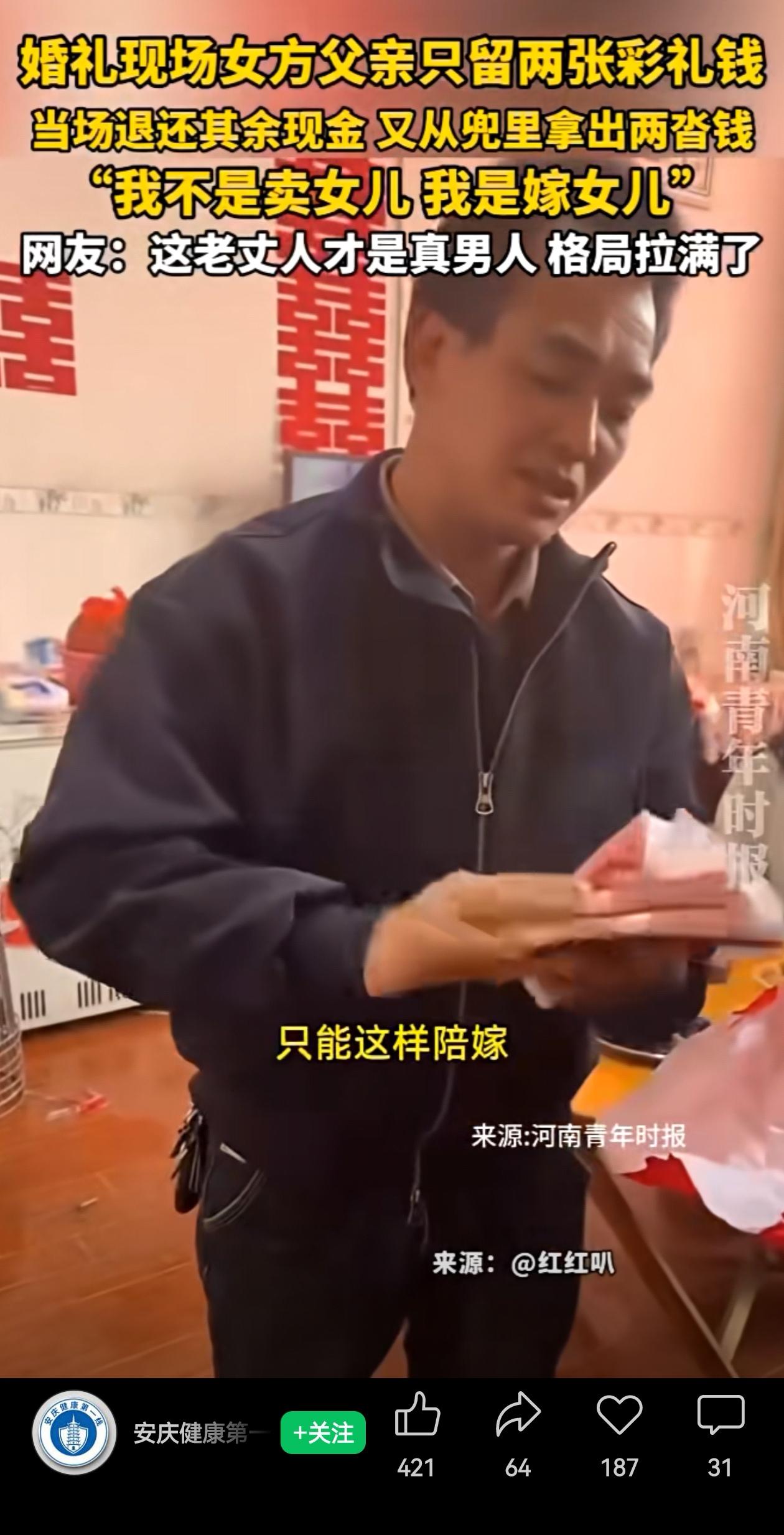 广西这位老丈人,真是太爷们儿了!在婚礼现场,男方把彩礼递过去,老爷子接过来,没往兜里揣,而是直接抽了两张出来当个念想,剩下的“啪”一下就塞回给新郎了,“我不是卖女儿,我是嫁女儿。” 这还没完,紧接着自己又从兜里掏出两沓现金,递给女儿当陪嫁。 今年中央一号文件刚发布,一项重要内容就是“持续整治农村高额彩礼”。今天看到广西这位老丈人,这不就是活生生的典型嘛! 中央一号文件说要培育“简约文明的婚俗文化”,这位老丈人身体力行实实在在地落实了中央文件精神,彩礼接过手,抽两张留个念想,剩下的全退回去,还自掏腰包给陪嫁。 “我不是卖女儿,我是嫁女儿”一句实诚话,把文件里那些号召全给演活了。 他这一退一给,等于用行动把这句话砸实了。他退的是钱,给的是底气。他不用告诉女婿“我女儿贵着呢”,而是祝福两个孩子:“你们好好过日子,比什么都重要!” 给这位广西老丈人点赞!也祝福这对新人,有这样的老泰山坐镇,小日子肯定越过越红火啊! 信息来源:安庆健康第一线