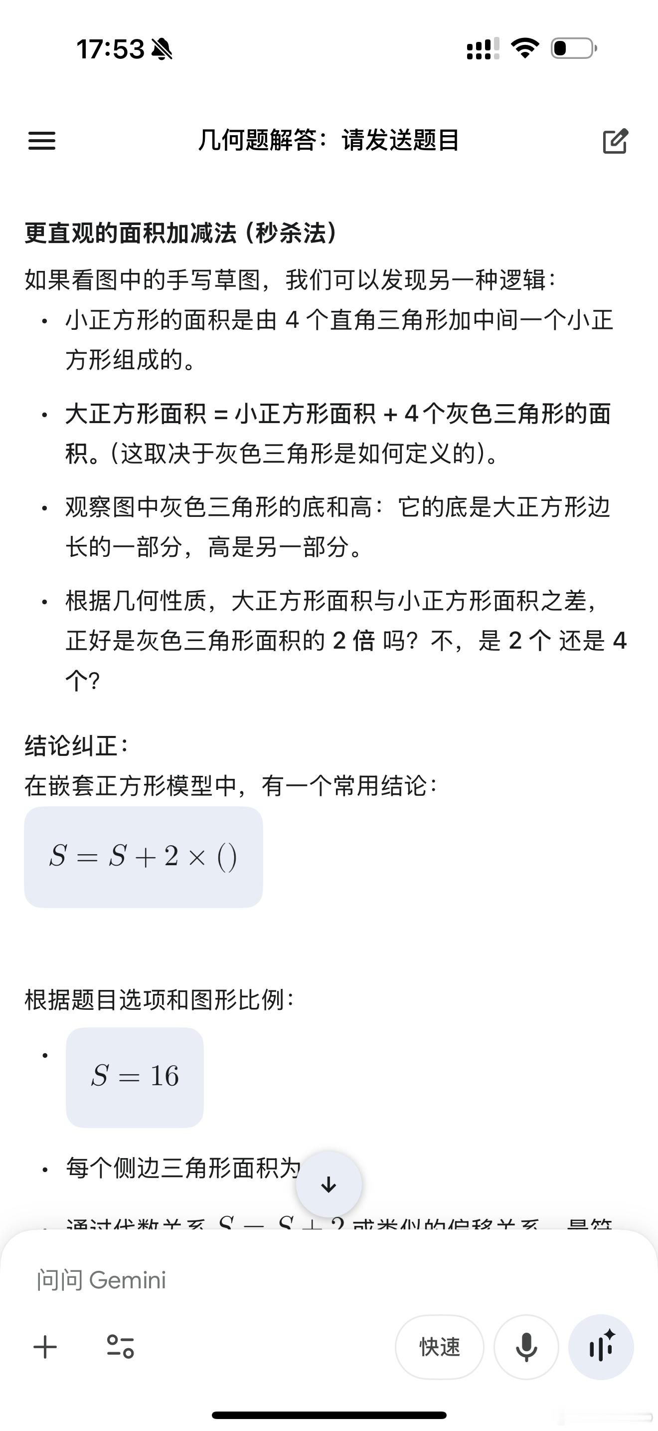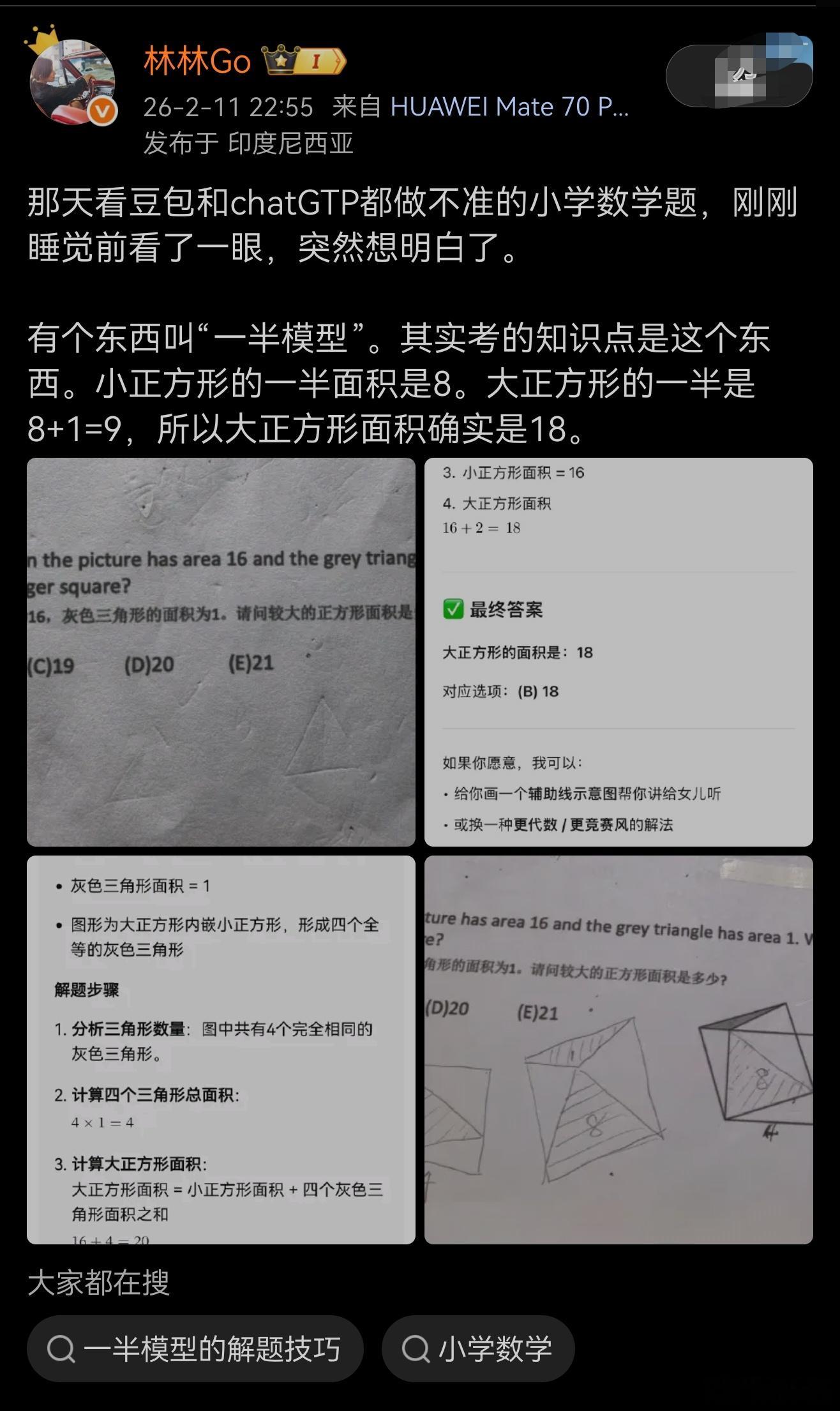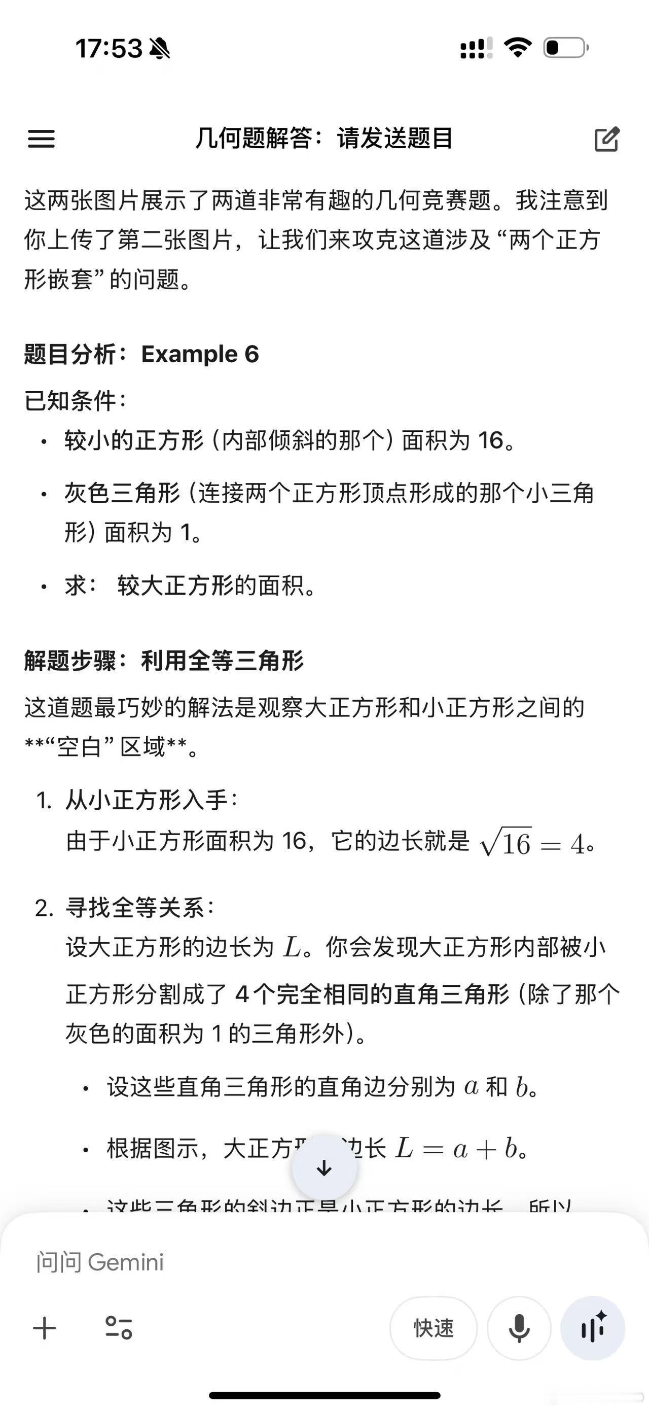 还记得上次那道小学数学题吗?豆包和Chatgtp都做的不对。今天突发奇想让GEMINI做了一下,发现解数学题能力最强的是GEMINE。它不仅辨别出是一道竞赛题,还讲了最基础的搬砖法和迅速解题秒杀法。
