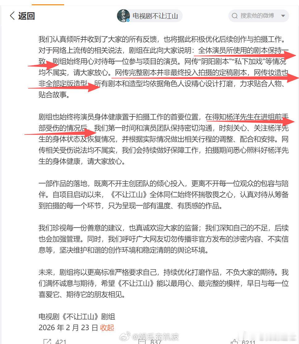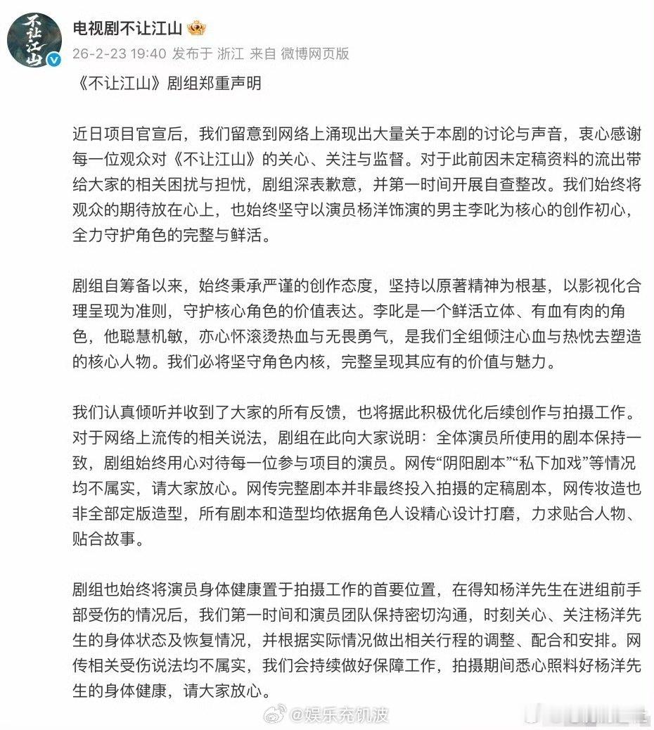 不让江山剧组声明 看完声明彻底不慌了!剧组明确杨洋核心主角地位,坚守尊重原著原则,不存在网传的各类负面情况。泄露的剧本、造型并非最终版本,剧组以真诚态度解决问题,杨洋方积极配合。相信费导的执导水准,相信杨洋的演绎实力,让我们聚焦作品,期待《不让江山》的精彩诞生!