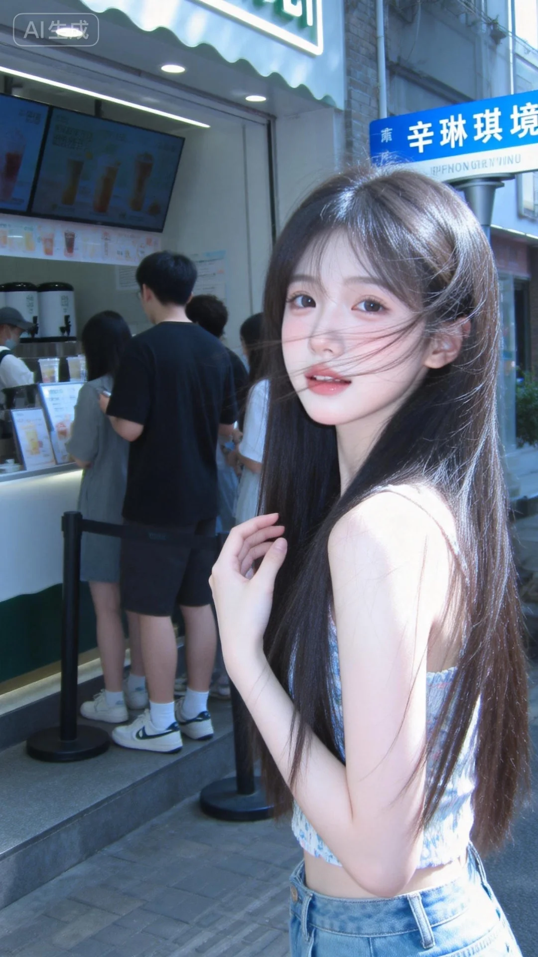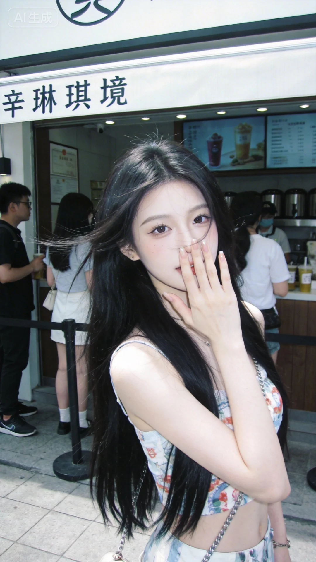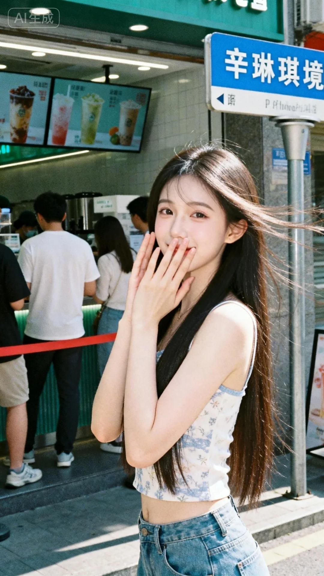 一位长发及腰、模样似洋娃娃般可爱的女生。构图随意却尽显生活中的绚丽日常,害羞,感受风,与镜头互动,人像摄影,日常快照风格,非精心构图或打光,妖冶少女,冷白皮,时尚穿搭,瓜子脸尖下巴,皮肤白皙,底妆通透,肤色均匀自然,纯欲风,发丝清晰可见,皮肤白皙,底妆通透,肤色均匀自然,纯欲风。光线柔和自然,非均匀打光,表情自然松弛,照片毫无修饰感,带有生活真实感。ccd拍照感,iphone实拍,真人,真实生活,背景写着辛琳琪境四字路牌,穿着夏季服饰,站在奶茶店门口排队