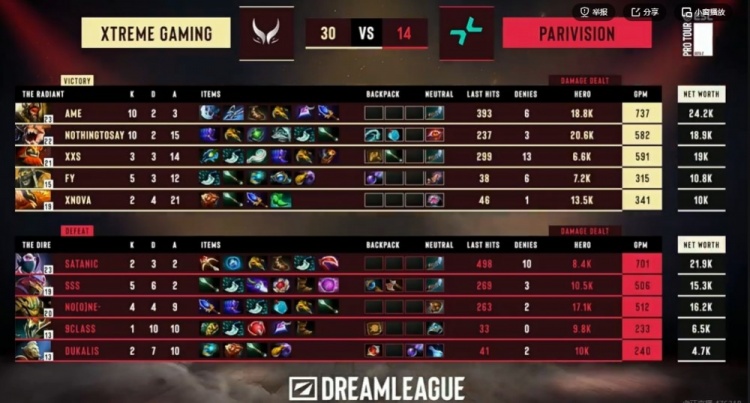 [29分钟]PARI三人上路动手想秒Xxs玛尔斯但是他有BKB啊!XG反打找到了Satanic的TA,吹风+Xxs玛尔斯框大将他和双酱油一起留住!又是一波0换3!随后XG拿下魔晶,11K经济差了!