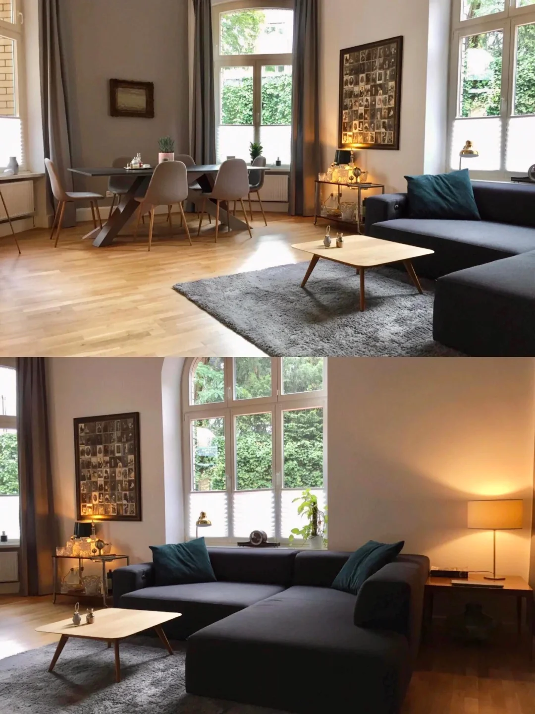 ▪️ 公寓宽敞,天花板超高,家具具有现代化的时髦感,两扇大窗映衬着窗外绿植十分漂亮