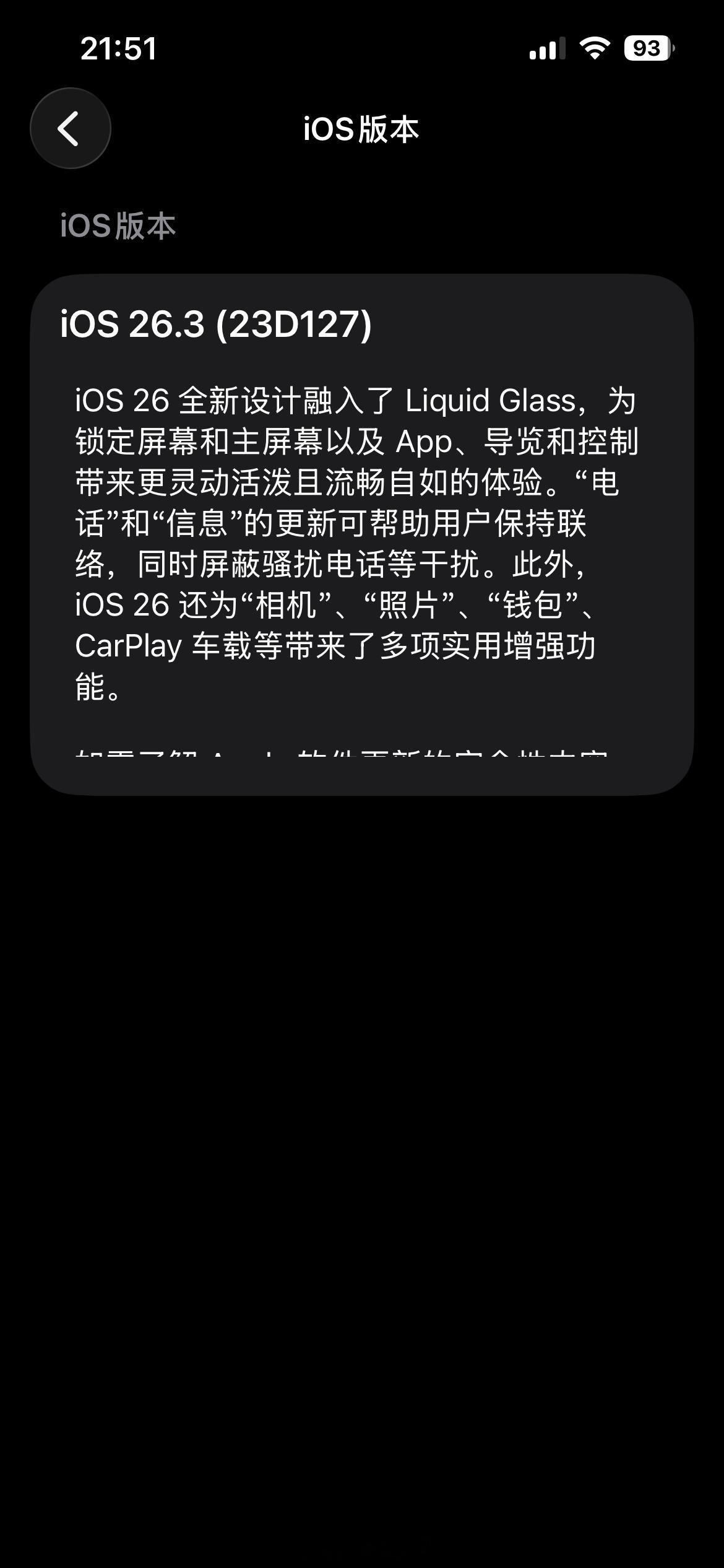 曝iOS26.3.1将发布前几天刚给我的iPhone13更新到iOS 26.3版