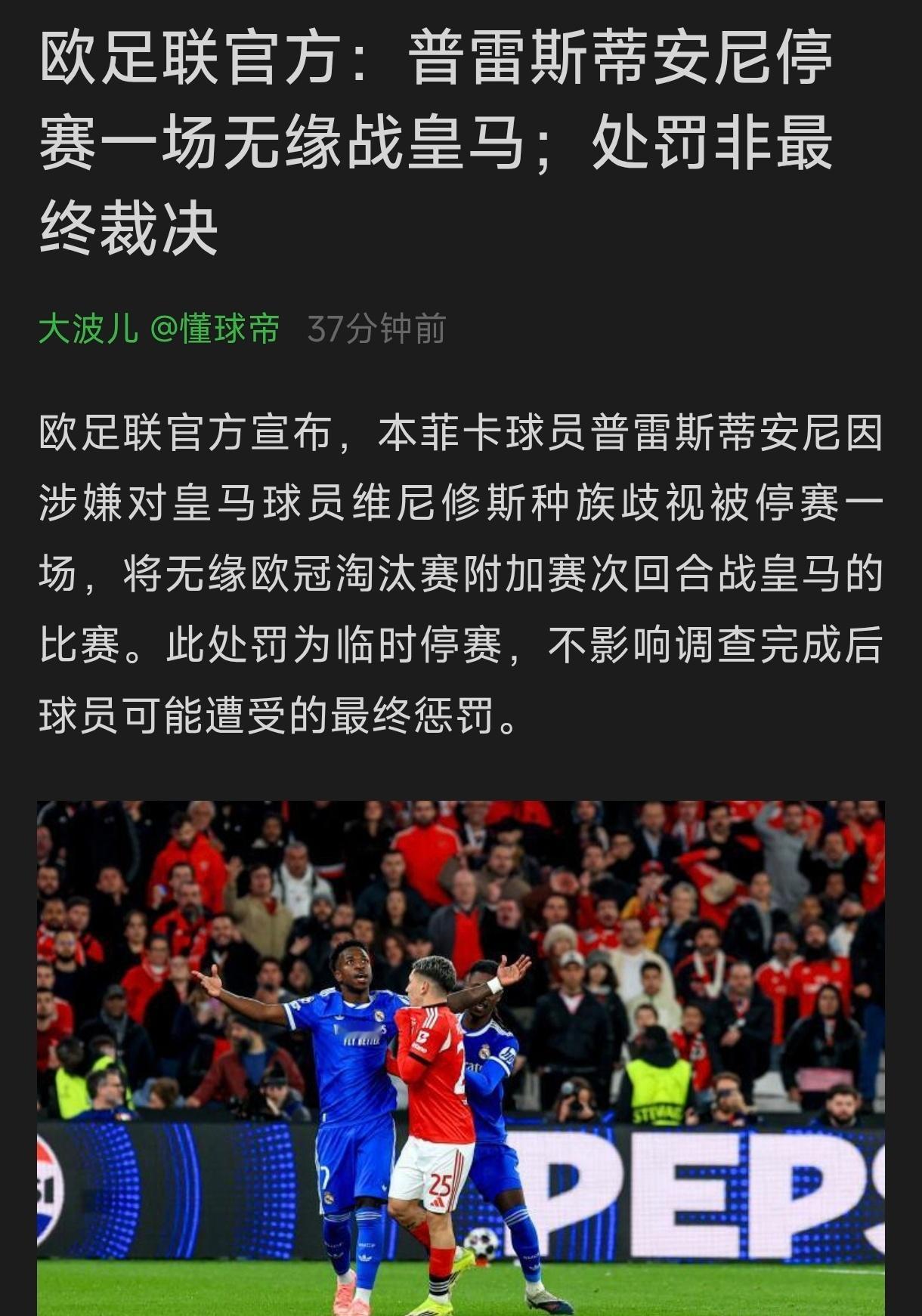 🚨ESPN报道,普雷斯蒂安尼已向欧足联陈述并证实,他当时称呼维尼修斯为"m*r