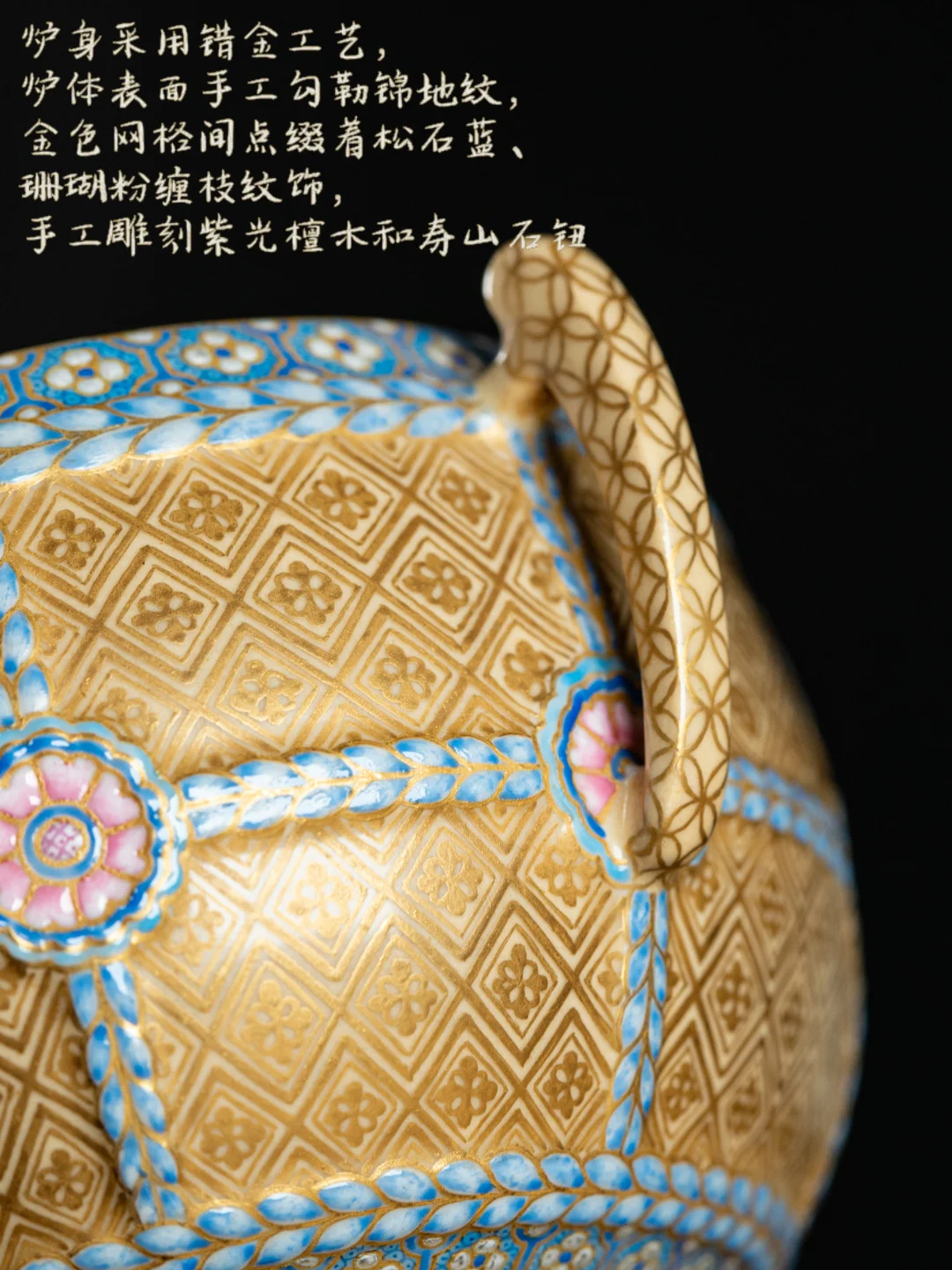 双鱼耳灵动,仿佛衔起炉身;锦地纹错金璀璨,点缀松石蓝、珊瑚粉缠枝纹,华美而不失雅致。“金玉满堂,如鱼得水”的寓意,既是对事业的祝福,也是对生活的期许。