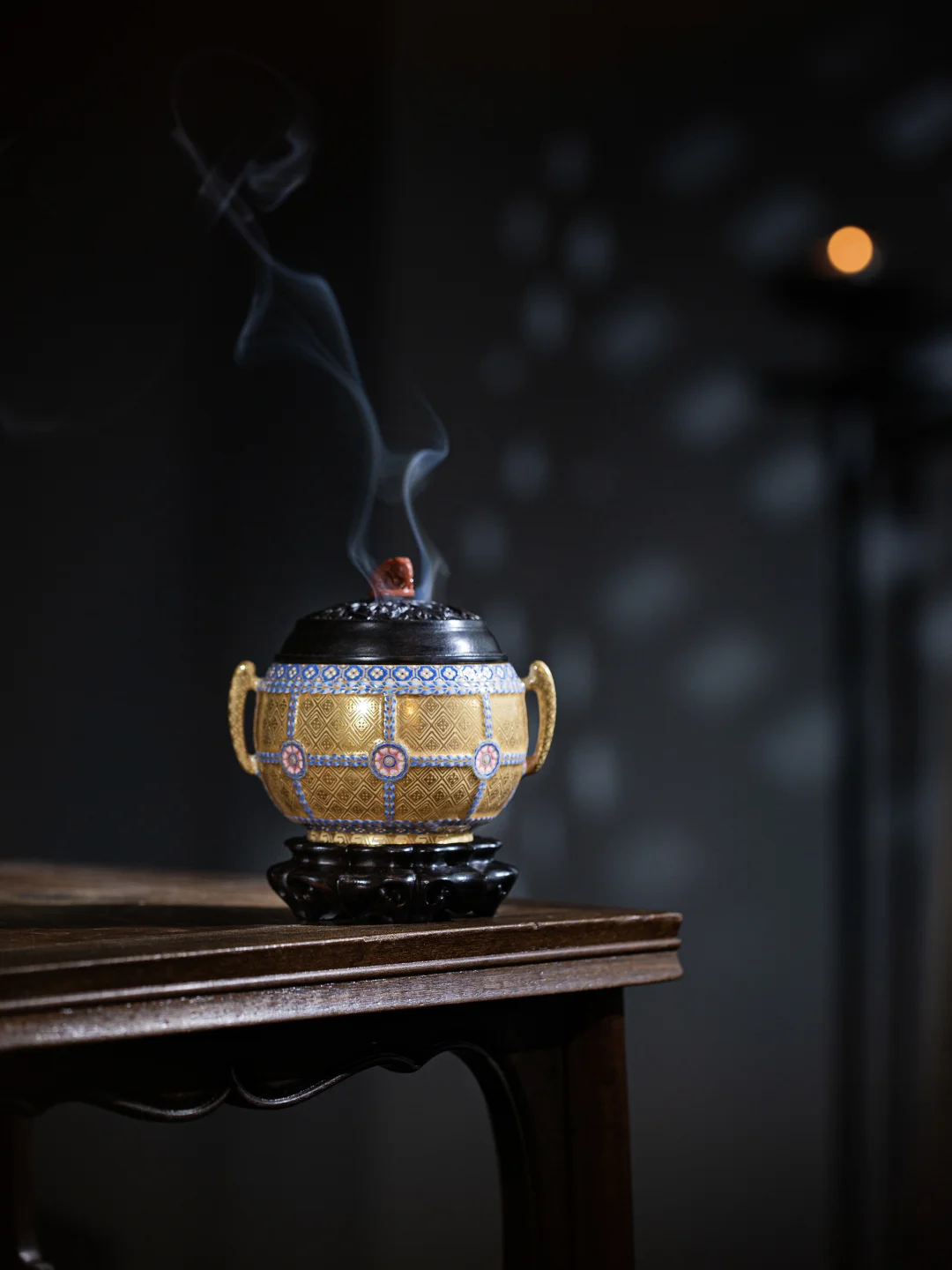 以“圆”为形,温润如玉。周身覆盖层叠珐琅彩,靛蓝、翠绿、深紫与描金交织,如星河在掌心流转。它既是收纳香品的实用器,也是一件可以时时把玩的掌中珍。圆满的形态,藏着对生活“圆融如意”的祝愿。
