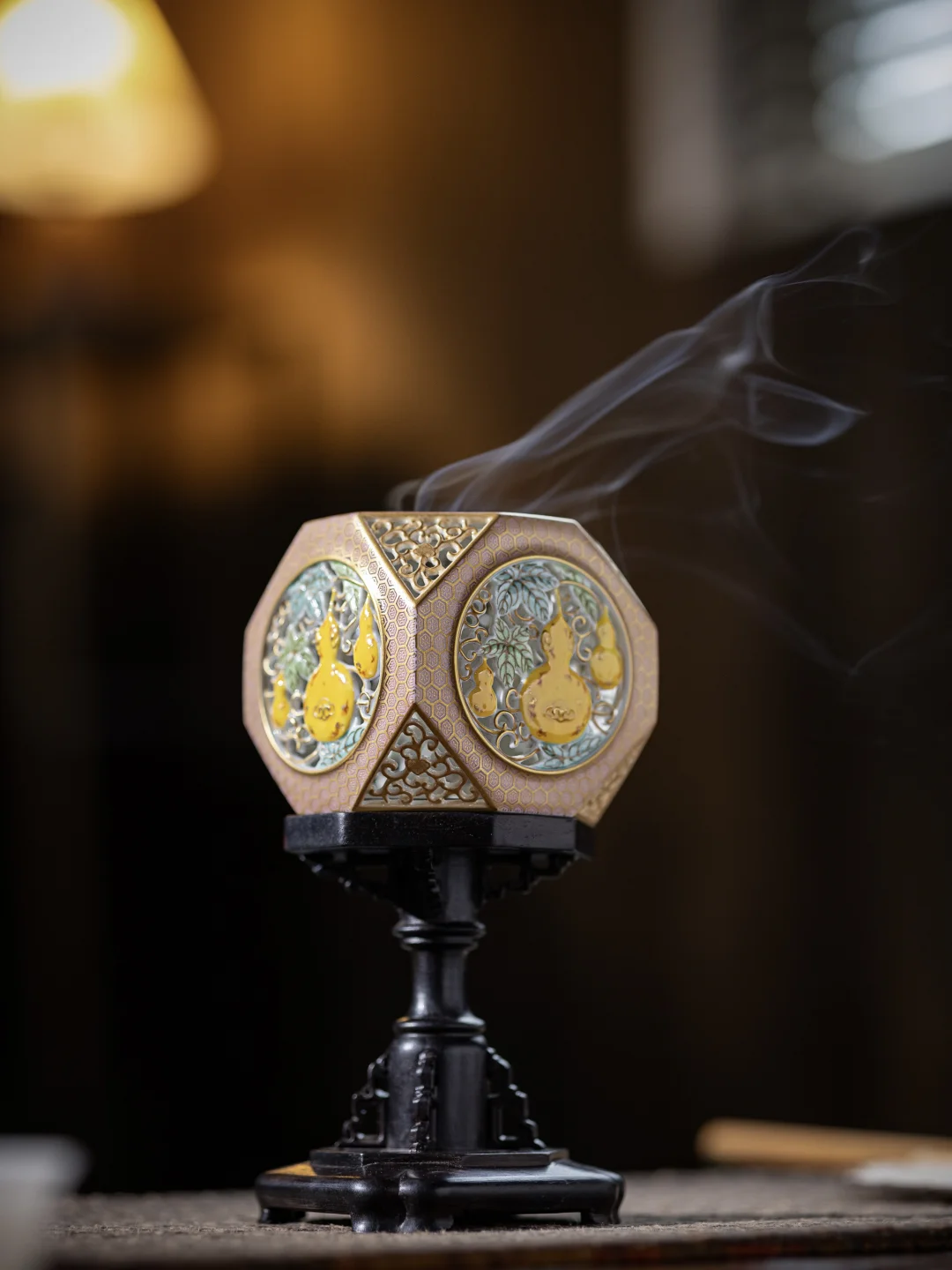 形如宫灯,通体多面镂空,光影交错间如华灯初上。葫芦缠枝莲纹,寓意“福禄双全,生生不息”。它不仅是香炉,更是一件能为空间增添华贵气韵的艺术陈设,适合赠予注重仪式感与生活品质的友人。
