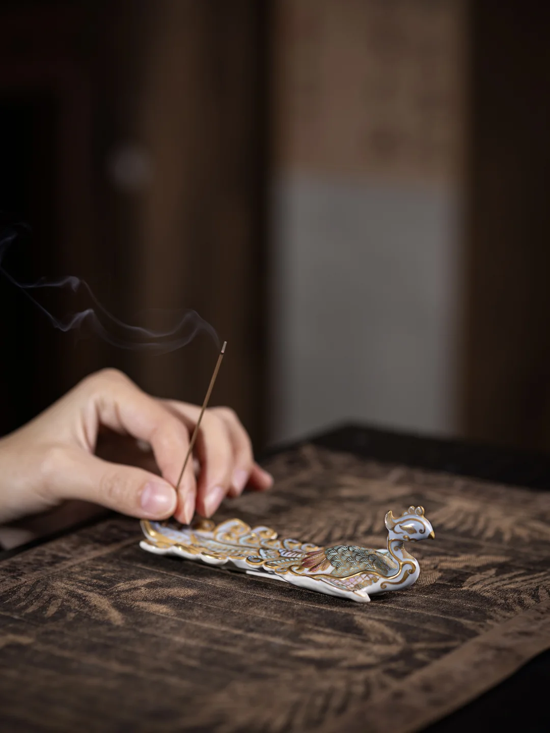 凤凰昂首,羽翼以卷草纹装饰,描金点缀,高贵华美。线香插入凤凰背部,青烟自祥鸟周身袅袅升起,仿佛开启一场与古老祥瑞的对话。赠予尊贵之人,便是赠予一份“和谐尊贵”的敬意。