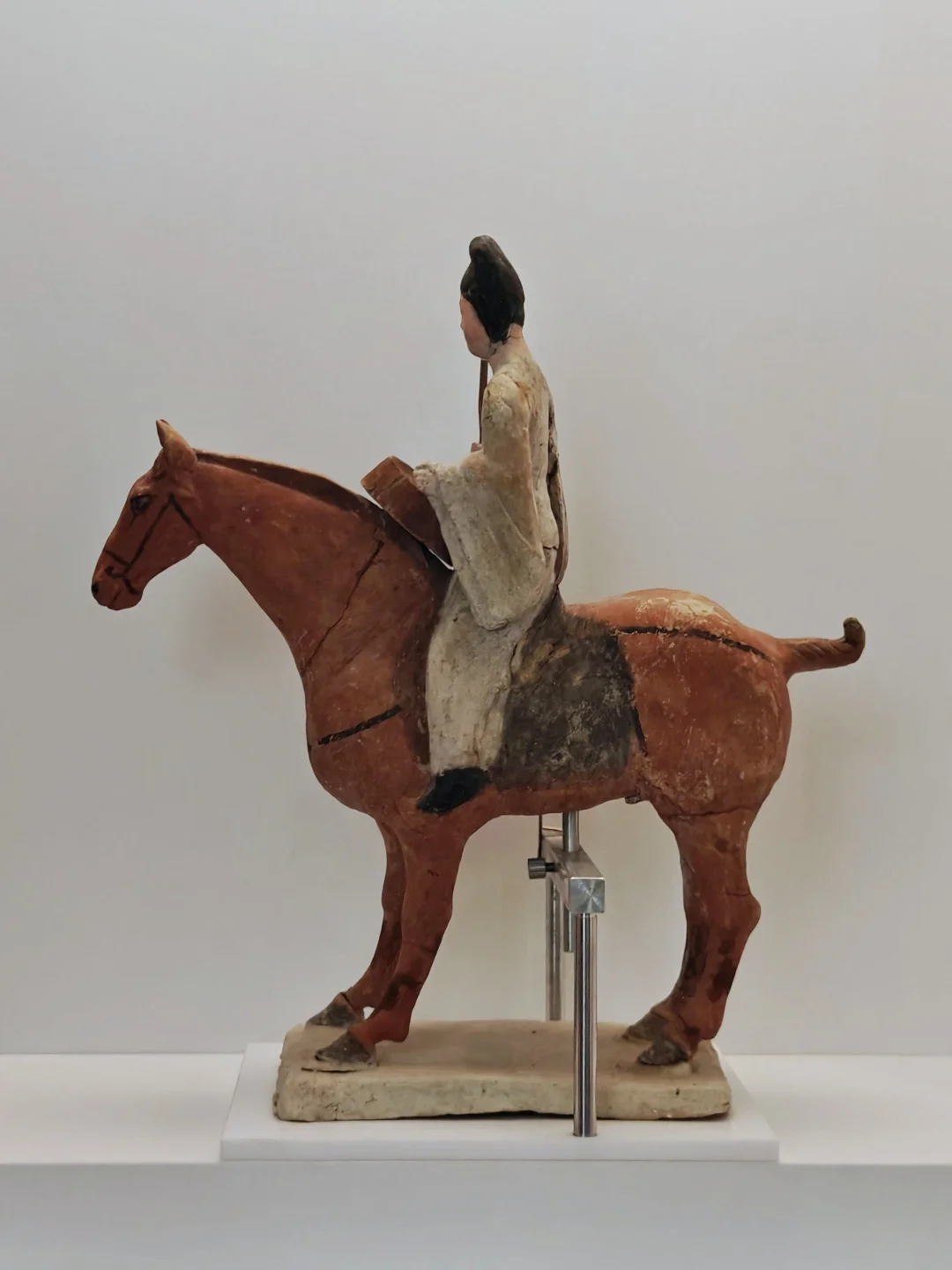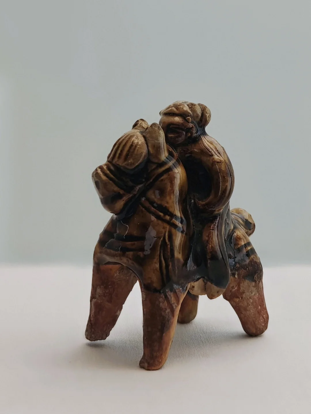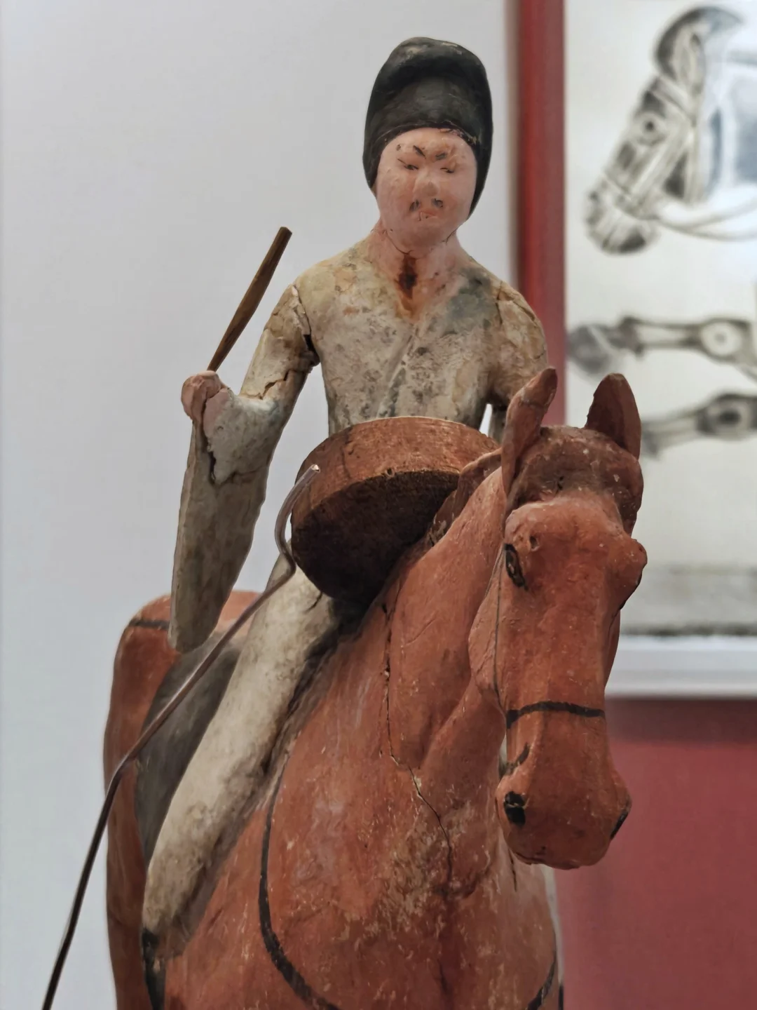 彩绘陶质,伎乐俑头戴笼冠、着阔袖白袍,跨坐枣红马上击鼓,马匹姿态稳健,属于唐代吐谷浑王族仪仗俑群,既体现了吐谷浑对中原葬仪制度的接纳,也展现了马在丝路文化交流中的礼仪功能。