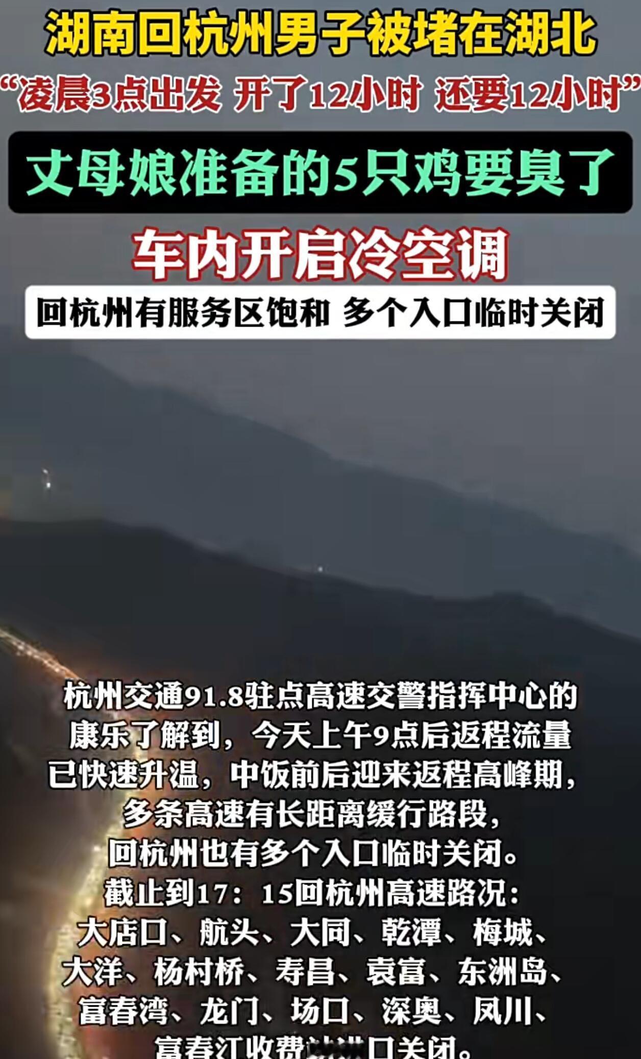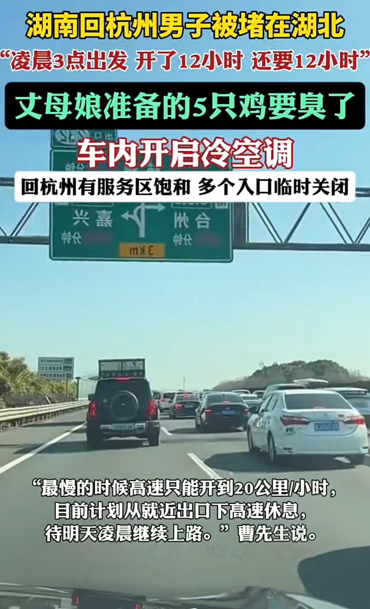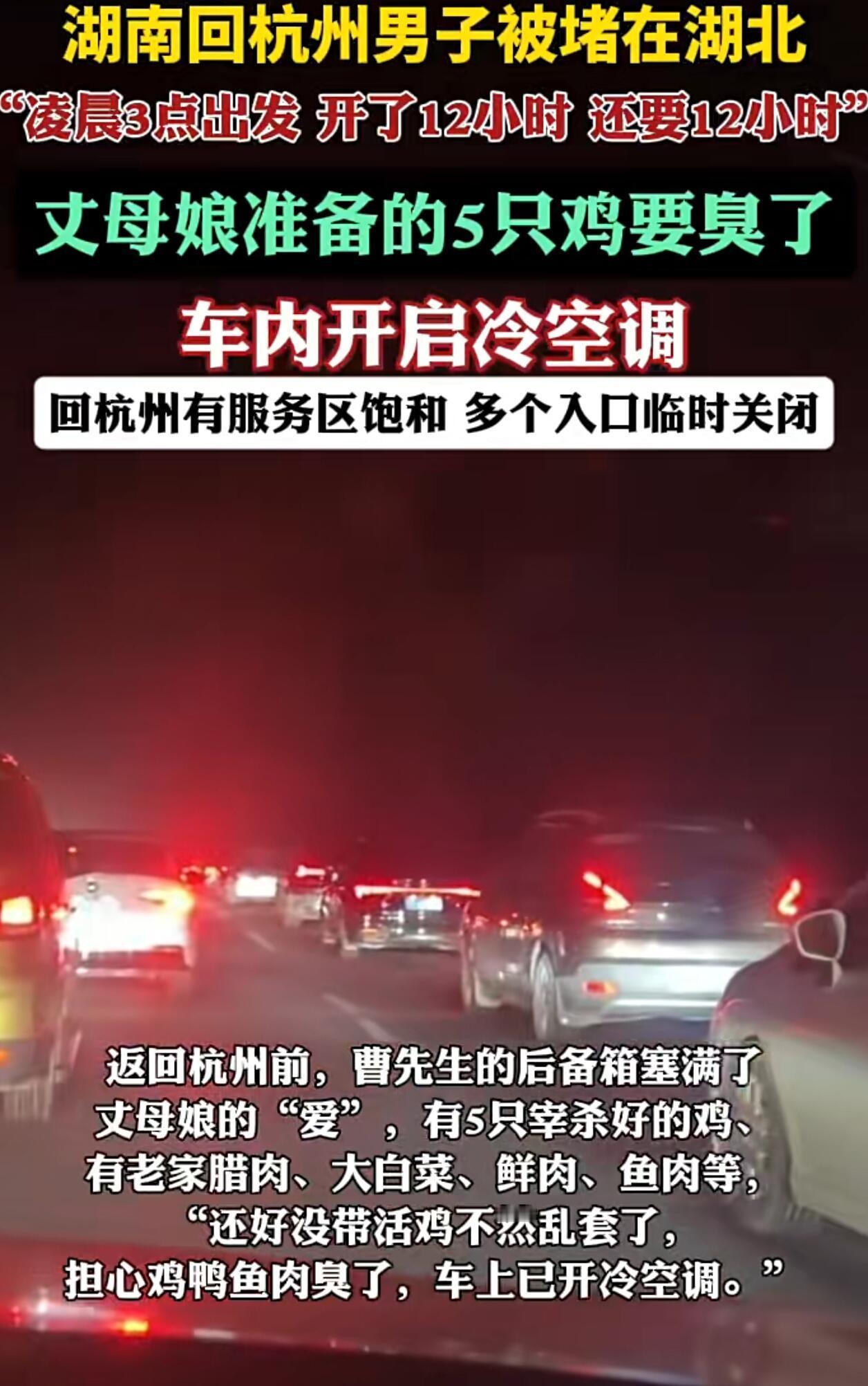 正月初六那天,杭州高速直接被返程车流“淹没”了。年后返程高峰杀到,网上全是吐槽。有个网友的故事特别绝,他本来计划12小时到家,结果硬生生开了24小时。 一路堵得昏天黑地,车跟蜗牛似的慢慢爬,每秒钟都急死人。更搞笑的是他后备箱,被丈母娘塞成了“年货仓库”。里面5只杀好的鸡码得整整齐齐,腊肉香喷喷的,鲜肉红彤彤的,还有各种鱼。网友自己都调侃:“幸好没带活鸡,不然车里得鸡飞狗跳!” 最惨的是,他怕这些肉在车里闷坏了发臭,一路上不敢关冷空调,冻得瑟瑟发抖还得咬牙扛着。 相信不少人返程时都有类似经历,后备箱被家人塞得一点缝都不剩,满满都是爱。你返程路上遇到过啥好玩的事儿?是也被年货包围,还是高速上碰到其他奇葩情况? 快来聊聊!
