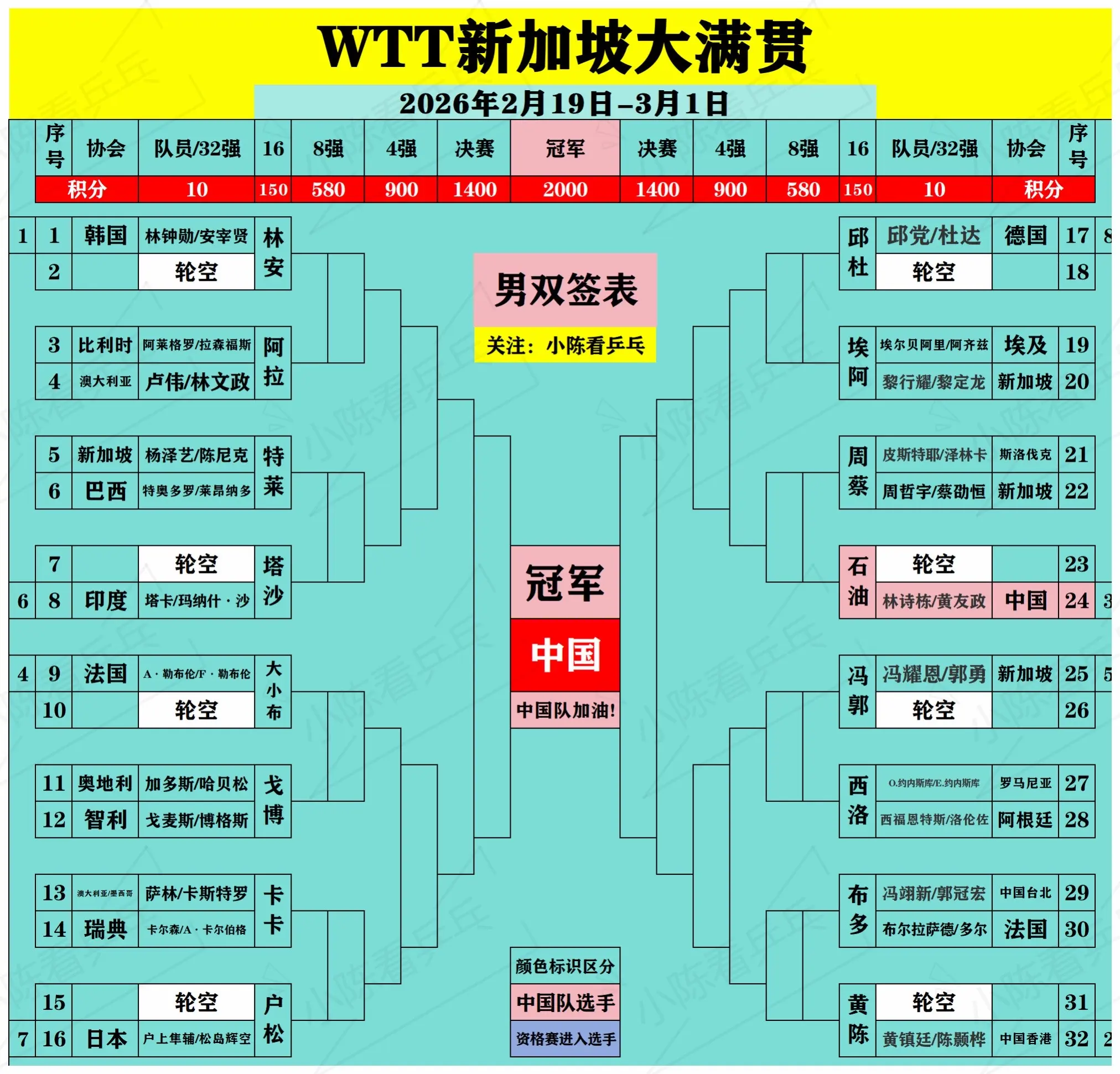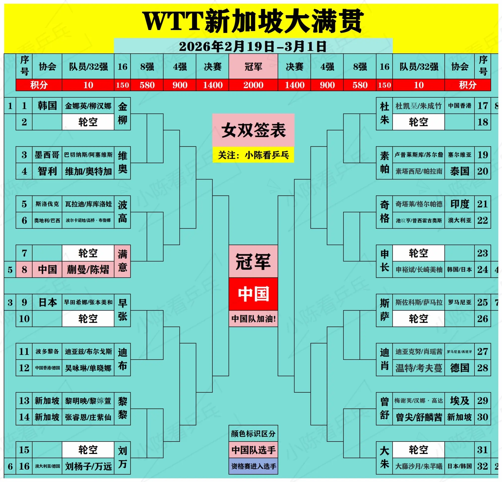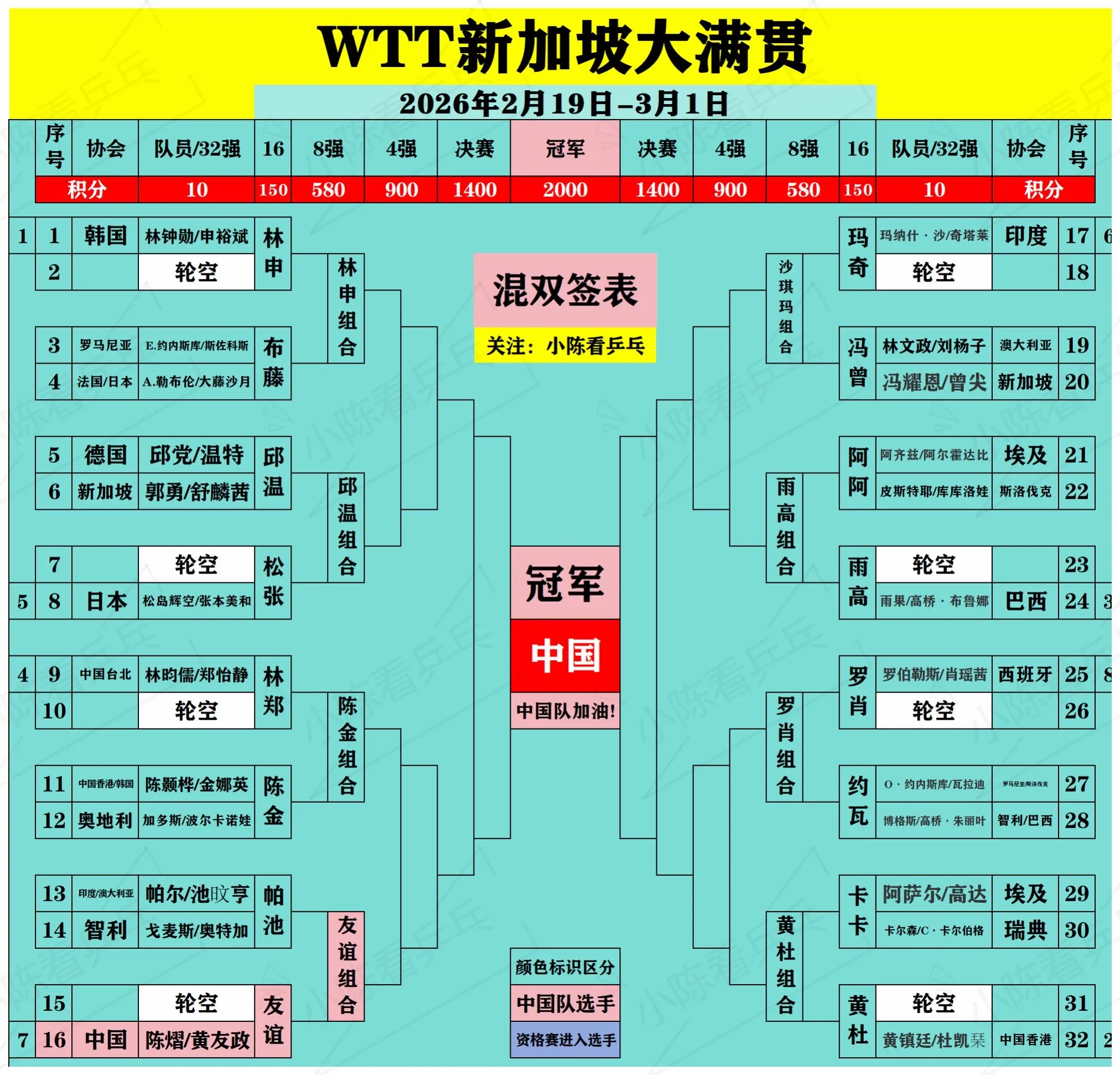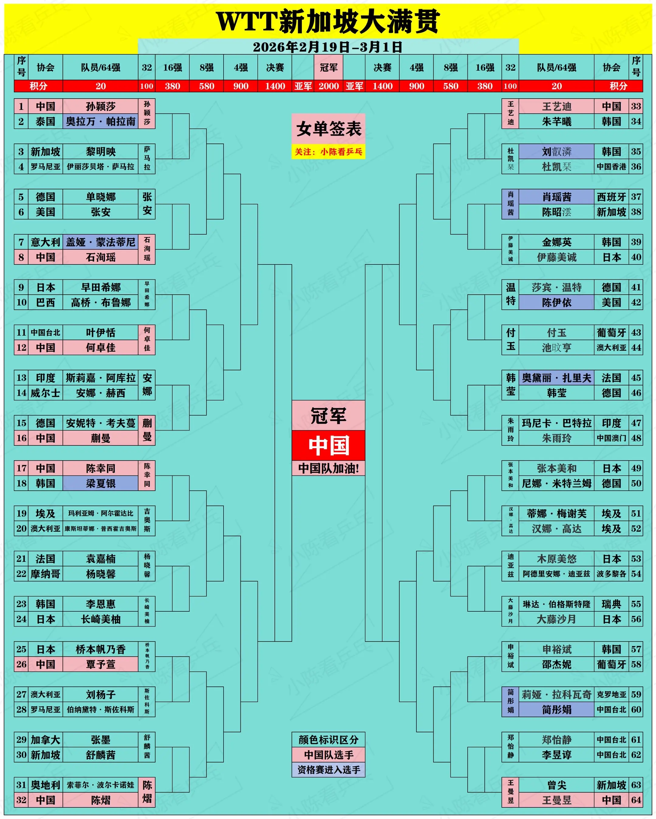 WTT新加坡大满贯签位图更新2月23日。WTT新加坡大满贯签位图更新2...