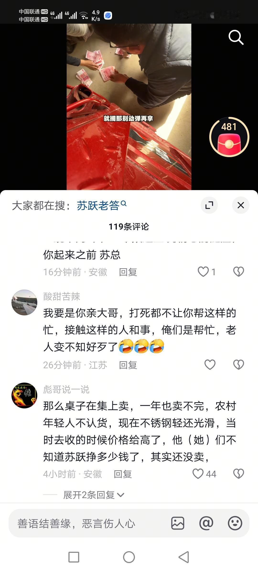 5800块钱他数好了递到老太太手里,老太太数来数去说少一百块钱,然后把钱一堆一堆的摆在地上,苏越没办法又当着老两口数了几遍,并一再声明自己是义务帮他们,没有赚钱。 可是,老两口没有表示丝毫的感激,尤其老太太数钱时的较真让人十分不舒服。让人想到救急不救穷的老话,真有道理! 有网友@酸甜苦辣评论: 我要是你亲大哥,打死都不让你帮这样的忙,接触这样的人和事,俺们是帮忙,老人变不知好歹了[捂脸][捂脸][捂脸] @彪哥说一说: 那么多桌子在集上卖,一年也卖不完,农村年轻人不认货,现在不锈钢轻还光滑,当时去收的时候价格给高了,他(她)们不知道苏跃挣多少钱了,其实还没卖完呢!