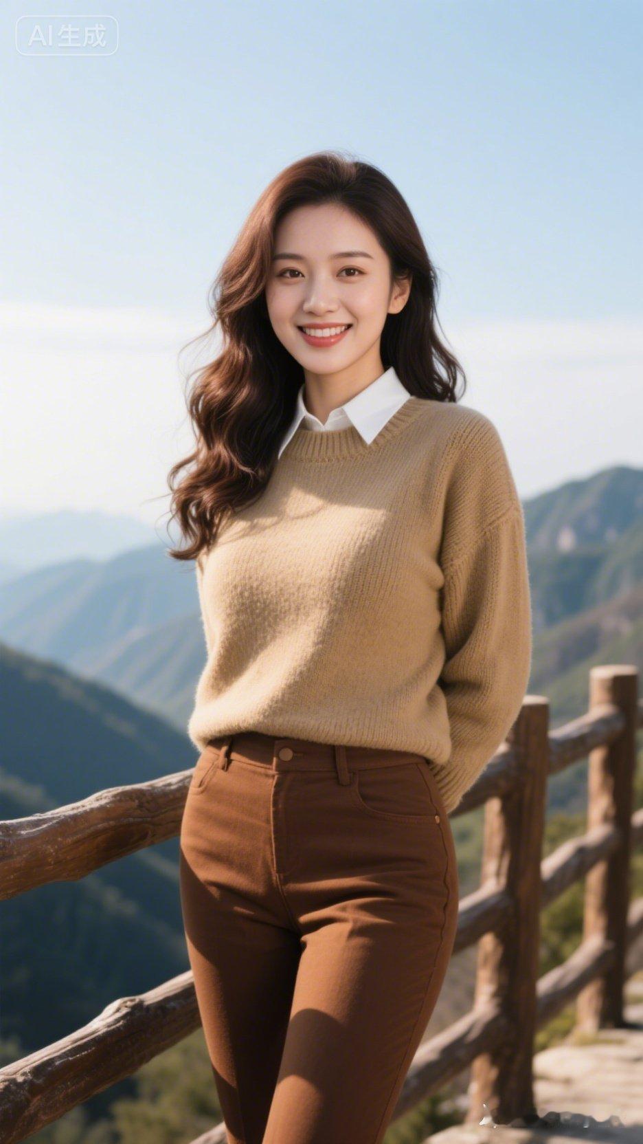 秋日暖阳下的甜美穿搭,温柔笑颜,自然山景作背景,尽显青春活力!🌞💖