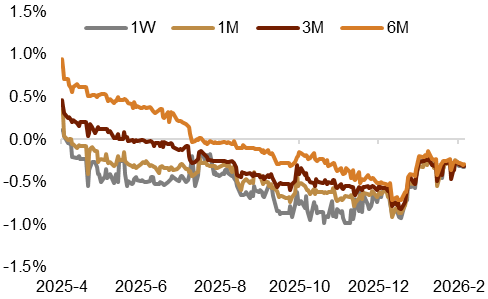 离岸人民币汇率小幅升值上周美元汇率反弹明显,在岸外汇市场因春节而处于休市,离岸人民币汇率小幅升值,对非美货币表现偏强。从外部因素来看,上周美元整体趋于反弹,不过周五美国最高法的判决结果对美元形成压力。美元指数全周走高逾0.9%,并推动非美货币大多走弱(图表8)。从内部因素来看,进入春节,离岸人民币汇率整体呈现出了一定的韧性,其在上周一升值超0.2%,在主要货币中位居前列。此后则更多随着美元汇率而双向波动。从风险逆转期权的表现来看,春节期间走势平稳,或显示当前市场对人民币汇率预期未出现明显波动(图表9)。