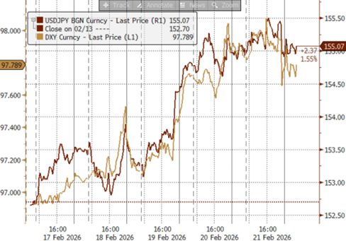 美元上周有所反弹,但其上涨在2月初高点附近有所停滞。上周公布的以PCE为代表的美国经济数据整体好于市场预期,而1月FOMC会议纪要也更偏鹰派,这些都支撑了美元的总体走强,而在周五美国法院裁决特朗普关税违法的消息后,美元的上涨动能有所减弱。目前OIS市场对下一次降息的时点预期自6月推迟至7月,但对全年的降息幅度的预期则继续维持在2次附近。