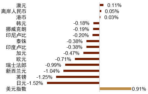 非美货币上周大多收低:唯一的例外是澳元,在市场对RBA的加息预期支撑下(目前市场预期5月前可能再次加息),澳元上周再次领涨G10货币。而受到油价上涨的支撑,挪威克朗和加元上周表现突出,两者分别小幅收跌0.19%和0.47%;欧元区2月PMI整体有所好转,这也限制了欧元周内下跌的幅度,欧元上周最终收跌0.71%;而英镑近期则受经济数据拖累,市场对英国央行降息预期有所抬升,英镑上周最终收跌1.25%;日元上周表现在G10货币中垫底,大幅收跌1.52%。在美元上周整体反弹的背景下,人民币在周内有所走弱,但整体依旧延续了近期的升值趋势,上周继续在年内高位附近徘徊。