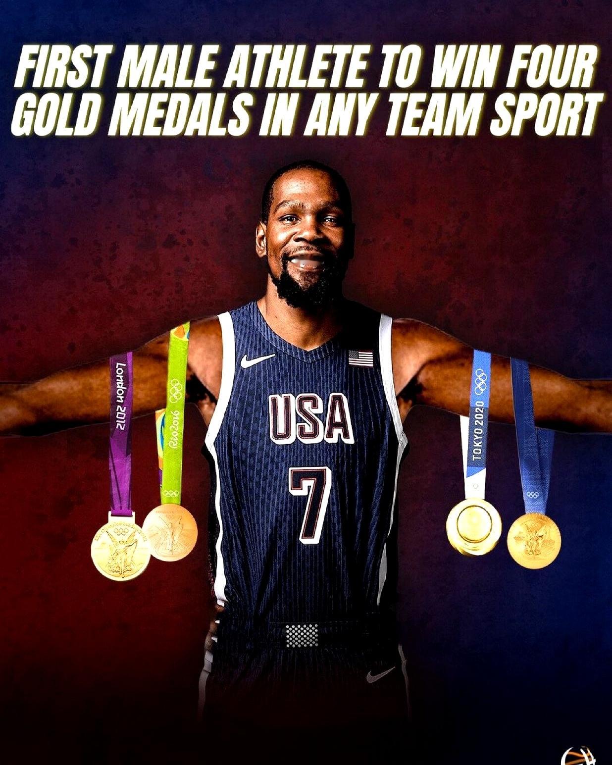 杜兰特是四届奥运金牌得主,也是美国男篮奥运历史得分王。