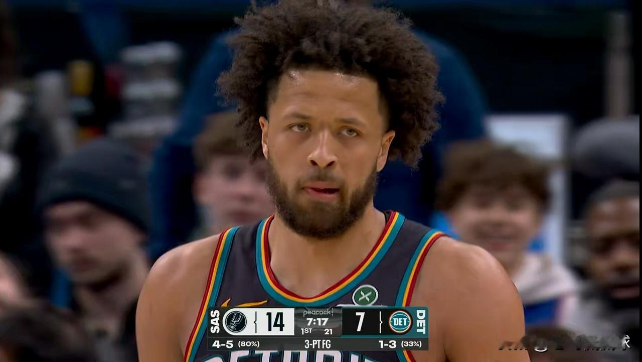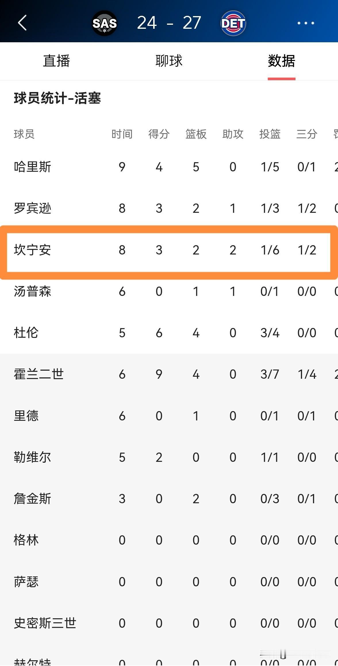 活塞超级巨星康宁汉姆真是忒低迷了!在今天活塞主场迎战马刺的焦点战中,目前双方的第一节比赛已经结束,虽然活塞以27:24领先对手,但是康宁汉姆的表现却非常的糟糕。 在首节比赛中,康宁汉姆首发出战8分钟,投篮6中1,其中三分球2中1非常低效的得到3分,还有2次犯规。 毫不夸张的说,如果康宁汉姆在剩下的三节比赛中继续低迷的话,活塞必败无疑。