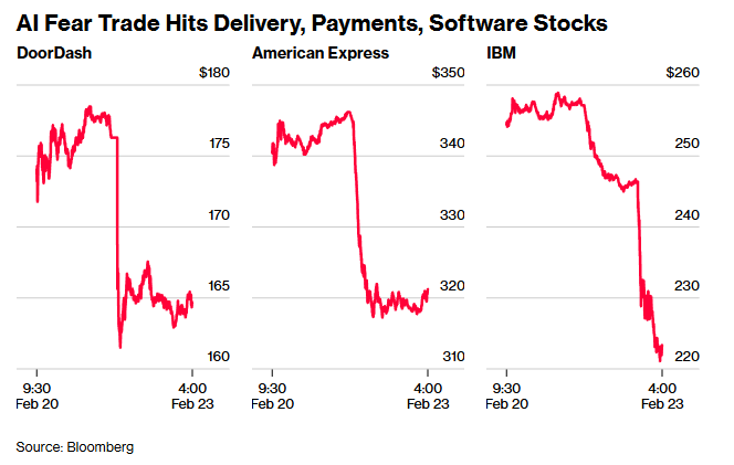 周一,人工智能(AI)“恐慌交易”再度爆发,对AI颠覆性力量的担忧日益加剧,拖累了快递、支付和软件公司的股价,并导致IBM(IBM.US)创下25年来最大单日跌幅。