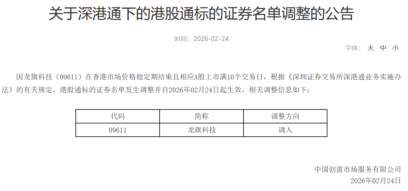 2月24日,深圳证券交易所发布《关于深港通下的港股通标的证券名单调整的公告》。因龙旗科技(09611)在香港市场价格稳定期结束且相应A股上市满10个交易日,根据《深圳证券交易所深港通业务实施办法》的有关规定,将龙旗科技调入深港通下的港股通标的,相关调整自2026年02月24日起生效。