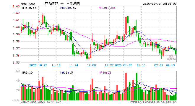 2月13日,券商ETF(512000)跌0.88%,成交额7.53亿元。当日份额增加2.66亿份,最新份额为696.30亿份,近20个交易日份额增加13.59亿份。最新资产净值计算值为390.14亿元。