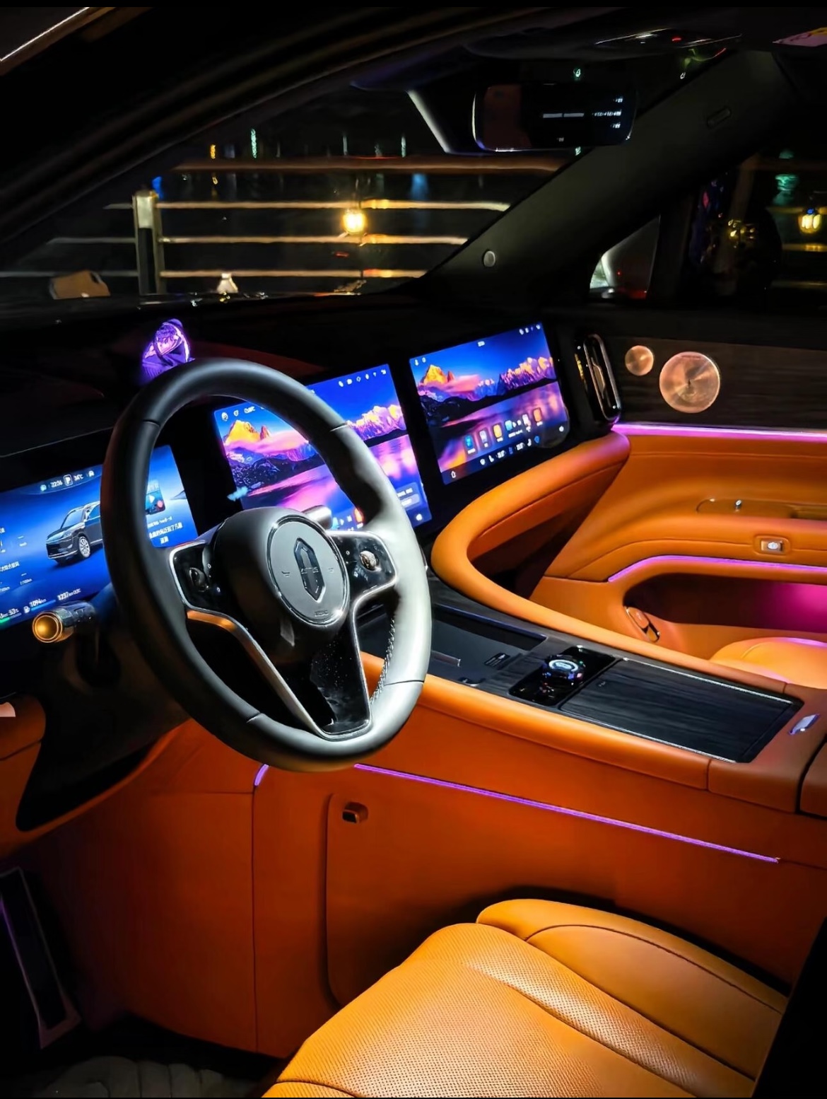 车身侧面堪称光影雕刻的奇迹!5米2超长车身搭配天际线腰线,流畅到离谱的曲面如游鲲破水,每一寸线条都在释放压迫感。隐藏式电动门把手与车身无缝贴合,21英寸星耀轮毂旋转间尽显奢华,风阻低至0.26Cd,颜值与性能双杀。金瑞红双色车漆源自东方皇家美学,金红撞色贵气逼人,开在路上就是移动的豪门名片。