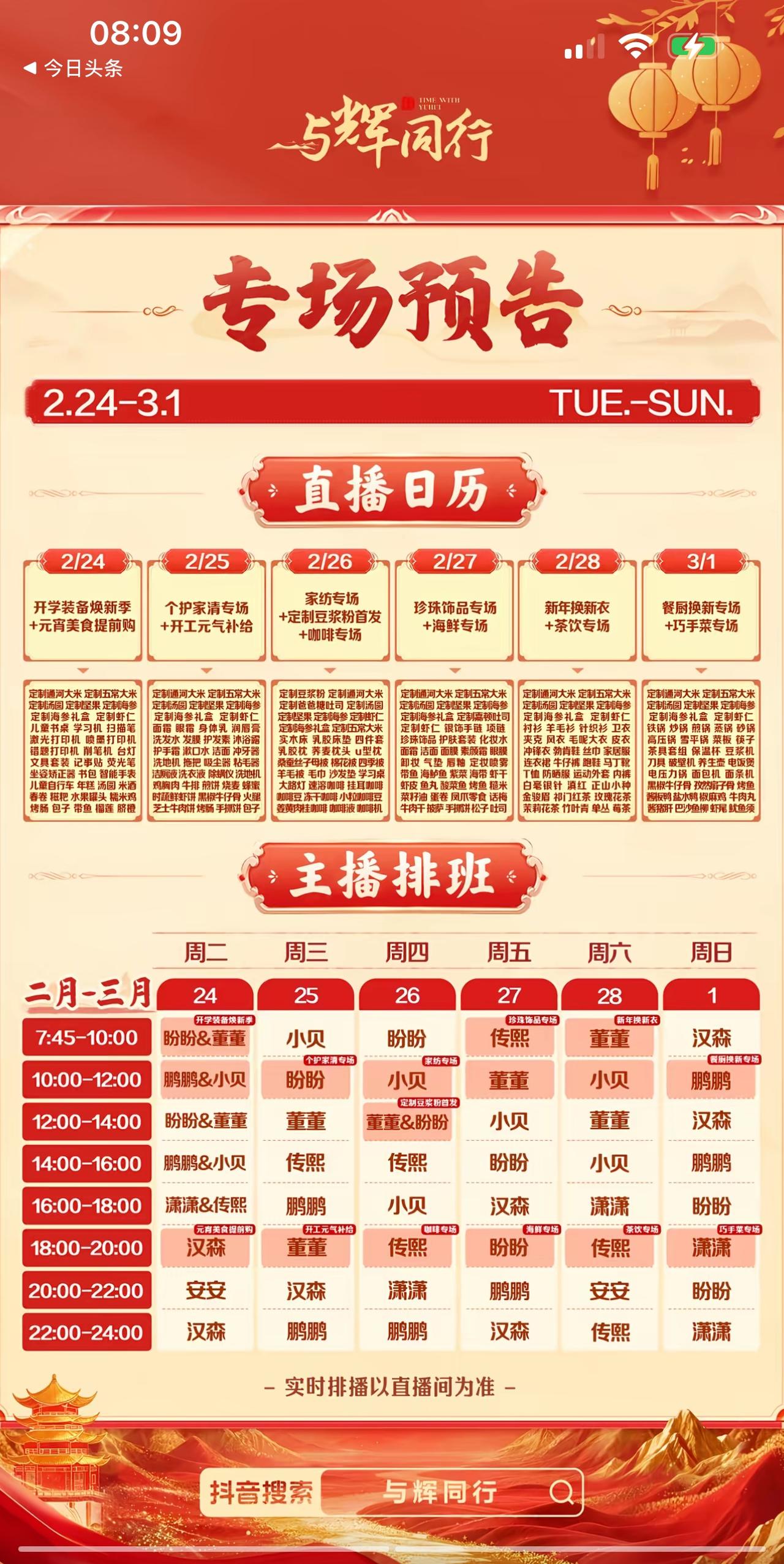 与辉同行超市开门大吉! 休息了十几天, 大家甚是想念, 盼望着他们早日开门, 今天正月初八, 终于开播了。 毫无悬念, 今天开播即是十万加, 稳占销售榜一。[大笑][大笑] “超市”关门十几天, 窗户没关严, 很多朋友翻窗进去“自取”, 销量还不低。 有朋友调侃, 与辉同行再不开门, “窗子”都快被大家翻烂了。 看看假期橱窗自主销售的单量, “黑黑”们又要崩溃, 不可能, 这怎么可能? 不直播了, 怎么还有那么多人在橱窗下单? 呵呵呵, 羡慕死你们, 这就是与辉同行消费者的粘性, 这就是大家对他们产品的信任。 一些直播间歇斯底里叫卖一大天, 还不如橱窗自动售卖。 看看这数据, 一些人继续去年的崩溃。 昨天晚上排班表出炉, 我非常认真仔细的看了又看, 三个字名字的主播没看见, 哎,到底是分别久了, 淡了, 上班哪有老家好玩? 人家说雪下大了回不来。[大笑][大笑] 这个借口很好, 不过他自己信了我不信。 等等吧, 元宵节之前肯定能等到那小子回来拉磨的。 祝福与辉同行马年大吉, 万马崩腾勇往直前! 董宇辉