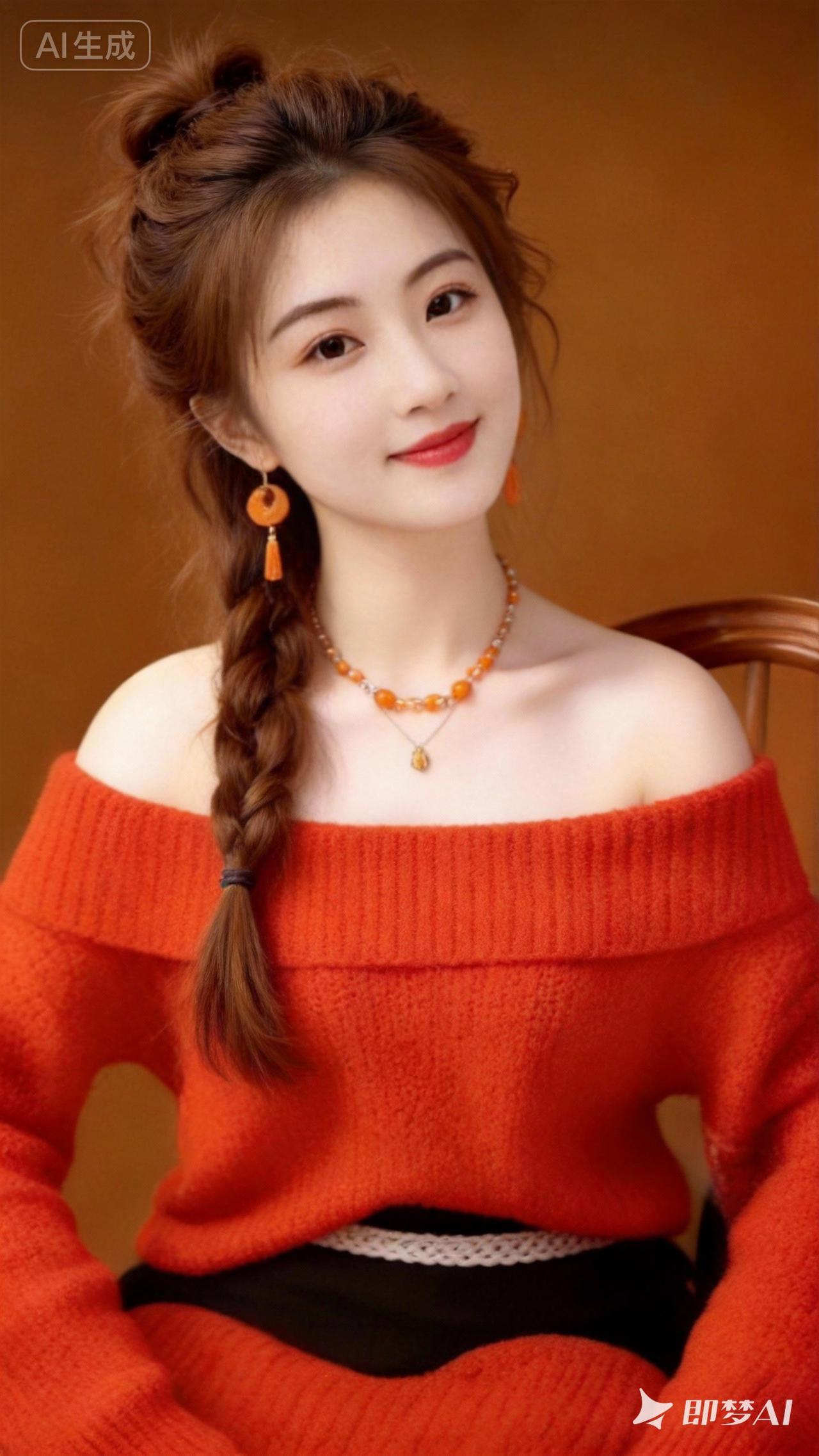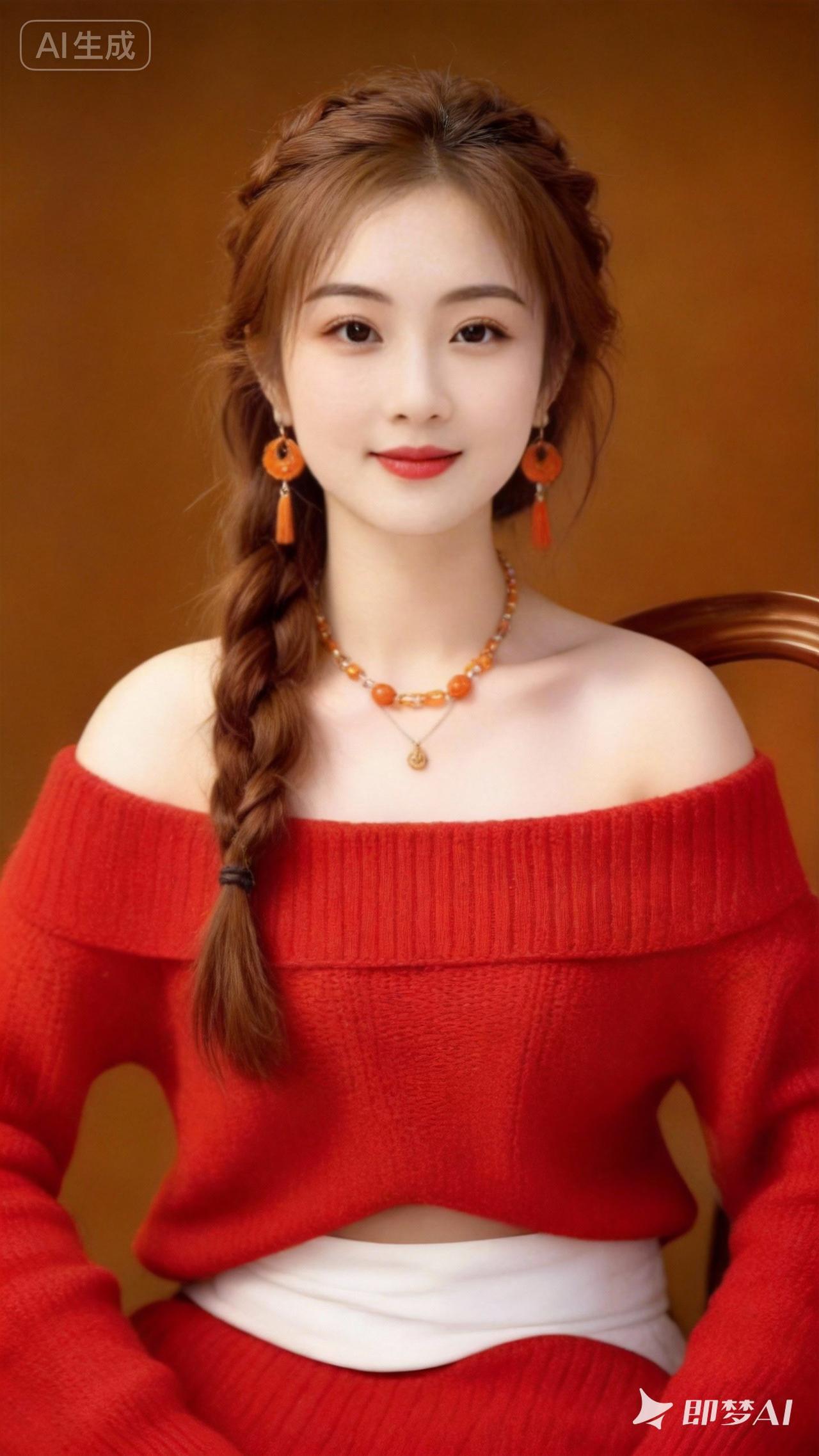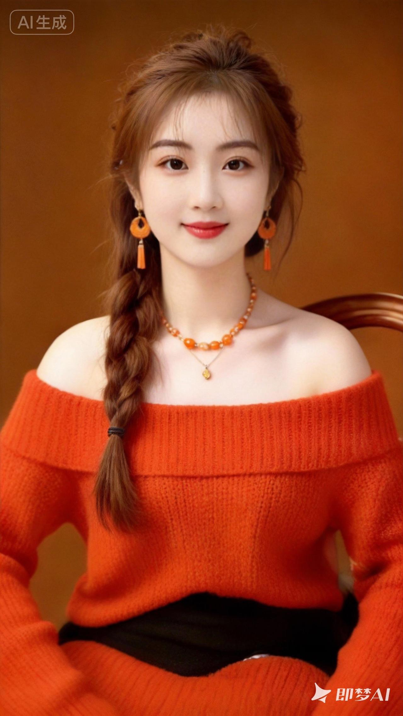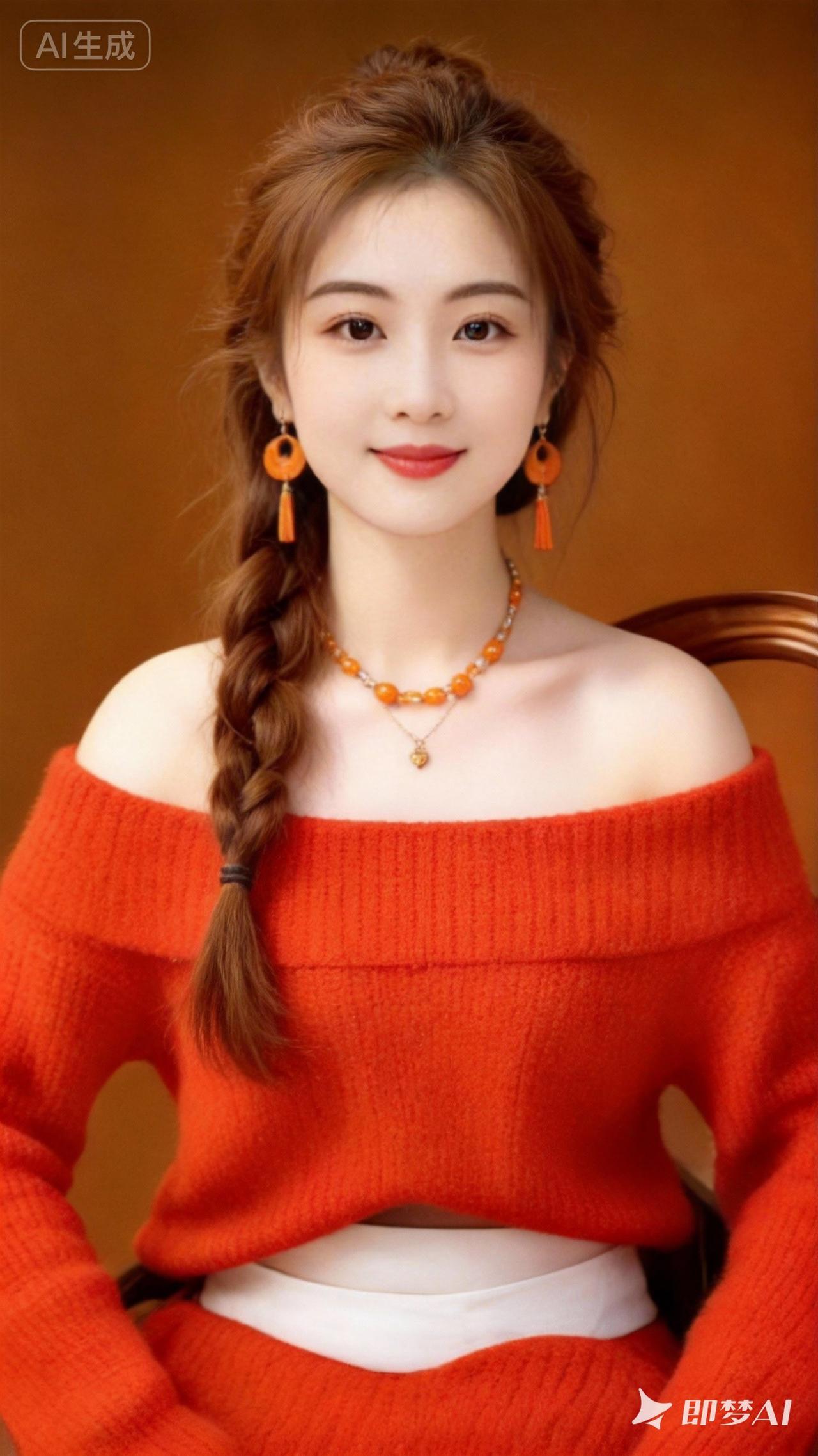 一位年轻女性,她身处暖棕色的纯色背景前,整体场景是简约的室内人像拍摄环境,没有多