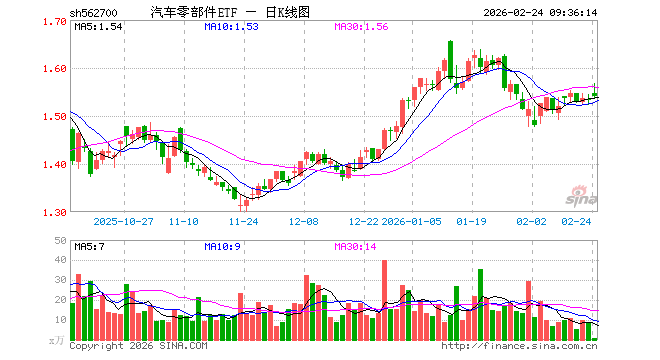 2月24日,汽车零部件ETF(562700)开盘涨0.72%,报1.546元。汽车零部件ETF(562700)重仓股方面,汇川技术开盘涨2.54%,三花智控涨2.88%,福耀玻璃涨2.56%,拓普集团涨1.78%,长盈精密涨0.92%,赛轮轮胎涨1.10%,德赛西威涨3.40%,双环传动涨3.12%,银轮股份跌0.28%,华域汽车涨2.26%。