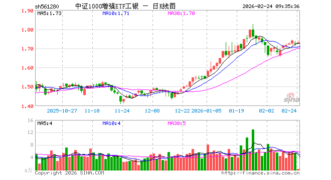 2月24日,中证1000增强ETF工银(561280)开盘涨0.12%,报1.725元。中证1000增强ETF工银(561280)重仓股方面,震裕科技开盘涨1.01%,宁波华翔涨1.97%,普利特涨1.00%,同方股份涨1.29%,凯盛科技涨1.54%,东方铁塔涨3.08%,中孚实业涨2.22%,利尔化学涨5.04%,高能环境涨1.71%,立中集团涨1.87%。
