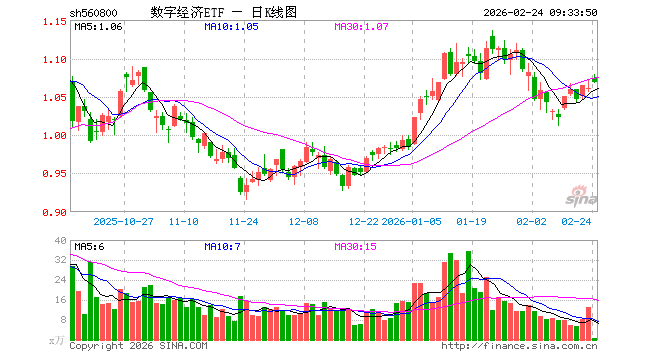 2月24日,数字经济ETF(560800)开盘涨1.23%,报1.074元。数字经济ETF(560800)重仓股方面,东方财富开盘涨0.54%,寒武纪涨1.39%,中芯国际涨0.94%,海光信息涨3.00%,北方华创涨1.17%,汇川技术涨2.54%,兆易创新涨2.85%,澜起科技涨3.27%,中科曙光涨1.96%,中微公司涨1.26%。