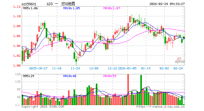2月24日,A50ETF(159601)开盘涨1.15%,报1.058元。A50ETF(159601)重仓股方面,宁德时代开盘涨2.00%,紫金矿业涨4.53%,贵州茅台涨2.40%,工业富联涨1.21%,中际旭创涨2.07%,比亚迪涨1.89%,寒武纪涨1.39%,洛阳钼业涨4.41%,招商银行涨1.27%,海光信息涨3.00%。