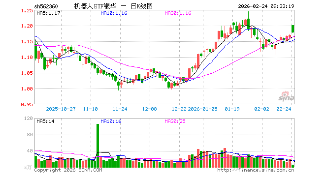 2月24日,机器人ETF银华(562360)开盘涨2.74%,报1.201元。机器人ETF银华(562360)重仓股方面,科大讯飞开盘涨2.24%,汇川技术涨2.54%,拓普集团涨1.78%,大华股份涨0.95%,大族激光涨0.42%,双环传动涨3.12%,石头科技涨1.48%,中控技术涨1.84%,绿的谐波涨0.02%,机器人涨3.15%。