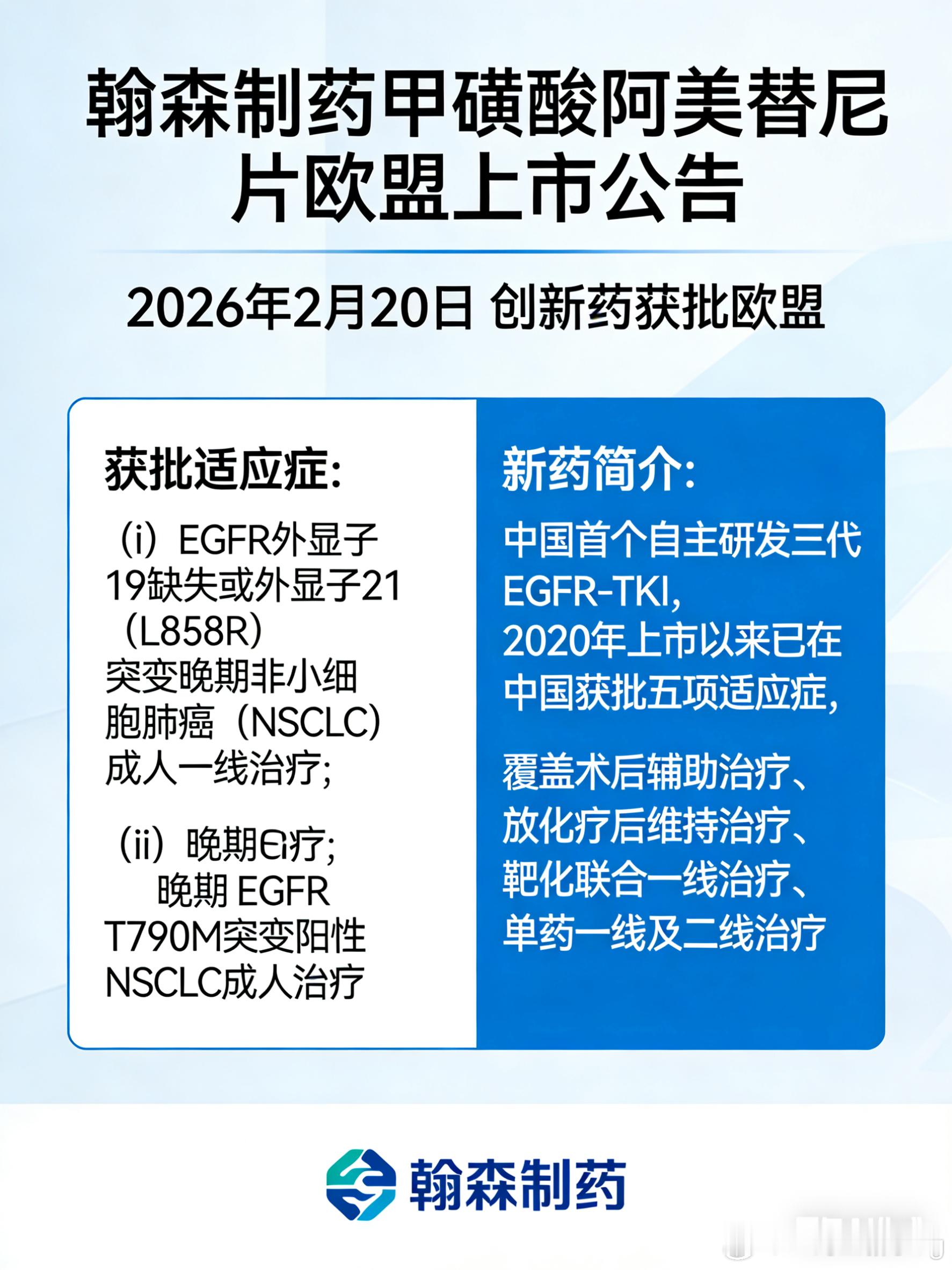 国际创新药闻健闻登顶计划 2026年2月20日,翰森制药宣布,创新药甲磺酸阿美替尼片单药治疗正式获得欧盟委员会(EC)批准在欧盟上市,用于: