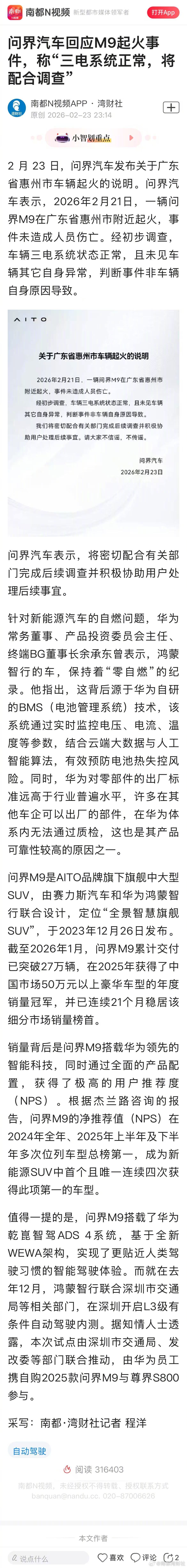 【#问界汽车回应M9起火事件#,称“三电系统正常,将配合调查”】#问界回应惠州起火事件#2 月 23 日,问界汽车发布关于广东省惠州市车辆起火的说明。问界汽车表示,2026年2月21日,一辆问界M9在广东省惠州市附近起火,事件未造成人员伤亡。经初步调查,车辆三电系统状态正常,且未见车辆其它自身异常,判断事件非车辆自身原因导致。问界汽车表示,将密切配合有关部门完成后续调查并积极协助用户处理后续事宜。记者 程洋