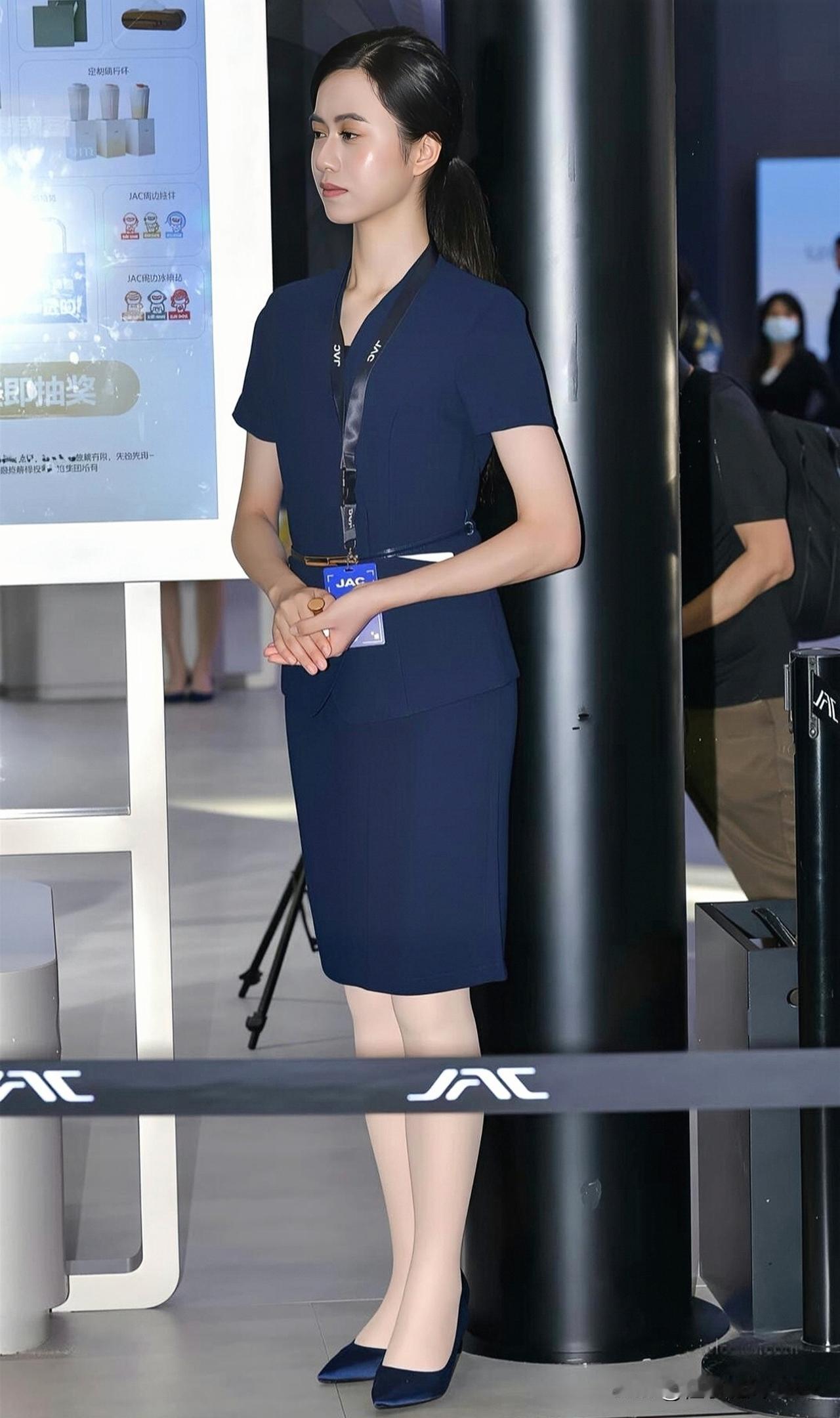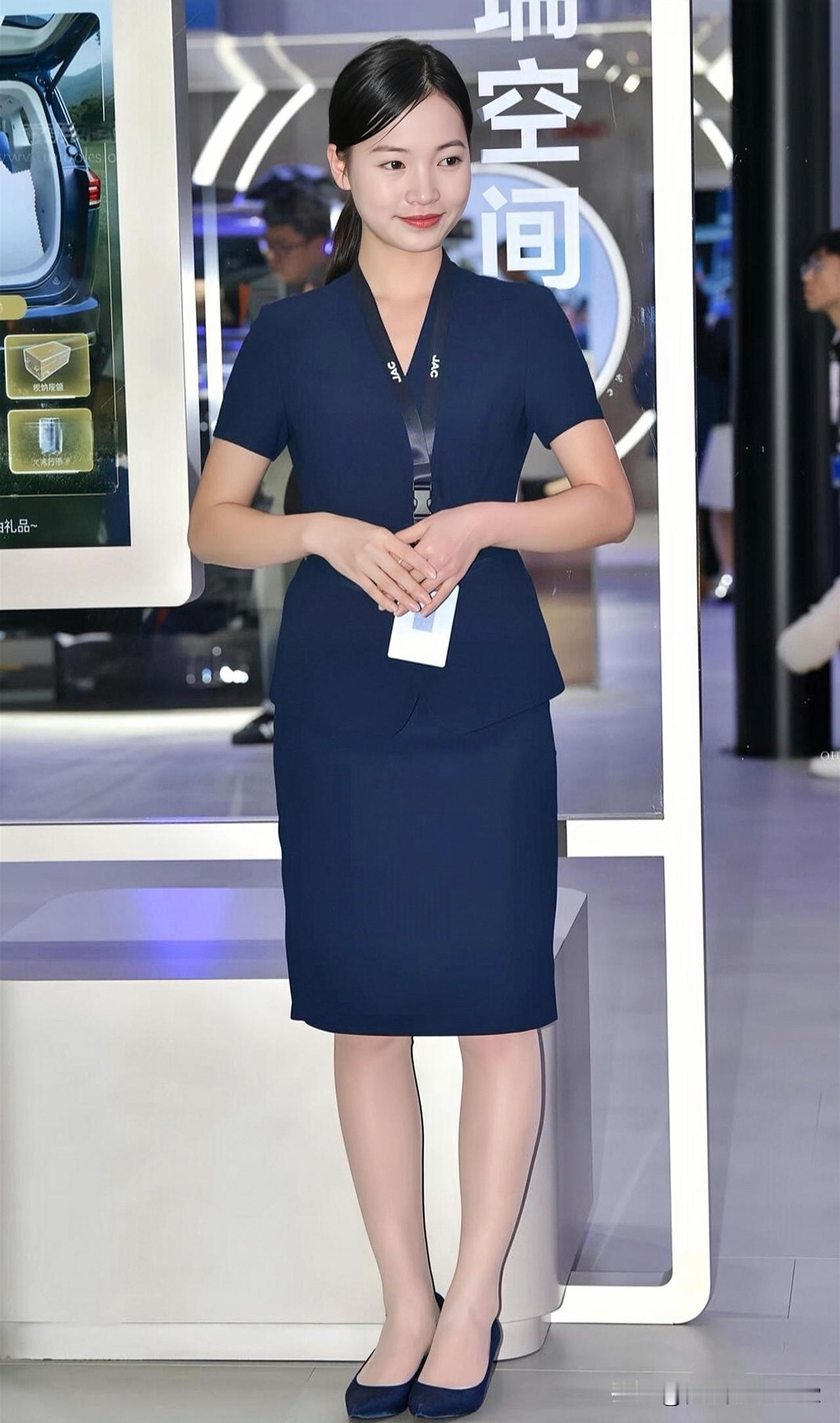 优雅车展现场,蓝色连衣裙搭配高跟鞋,尽显时尚魅力