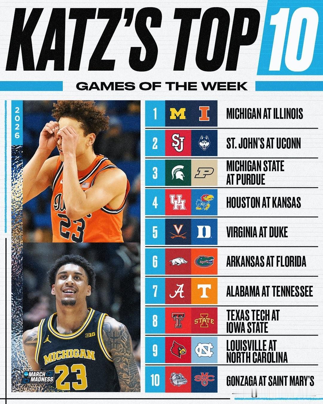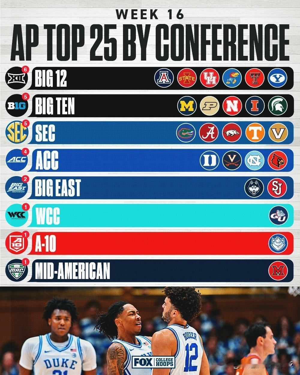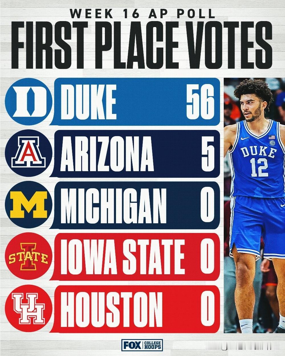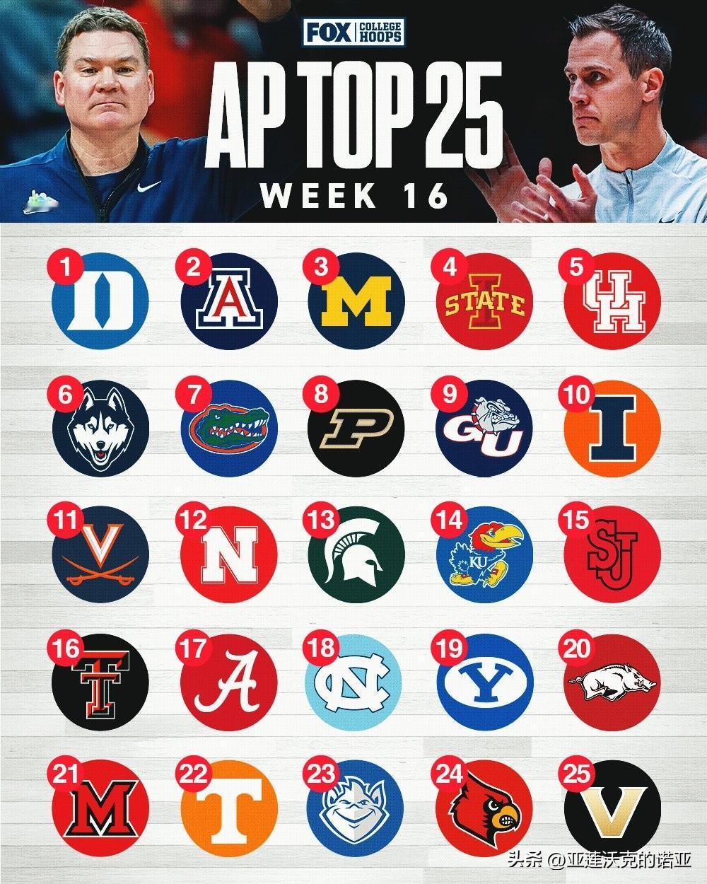 美联社公布第十六周前25强榜单,杜克大学本赛季首次登顶全美第一的位置,官网评选的上周最佳球队是亚利桑那大学与杜克大学,最佳球员是辛辛那提内线Moustapha Thiam,2026年nba选秀 最佳新人是杨百翰AJ Dybantsa。